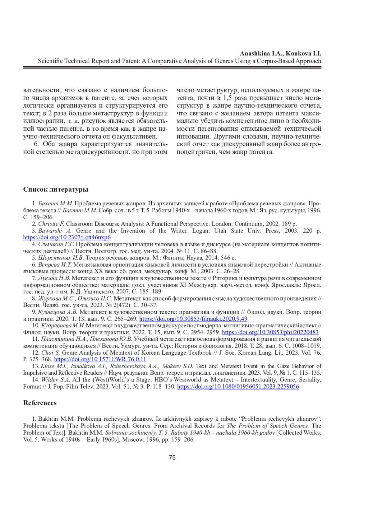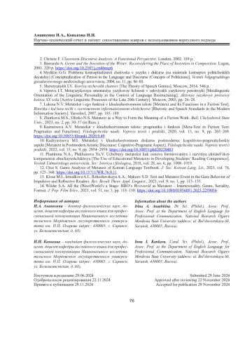 9. Кузнецова А.В. Метатекст в художественном тексте: прагматика и функции // Филол. науки. Вопр. теории и практики. 2020. Т. 13, вып. 9. С. 265-269. DOI: 10.30853/filnauki.2020.9.49 EDN: QSNFPD