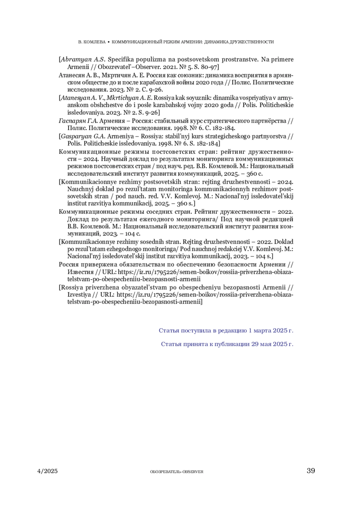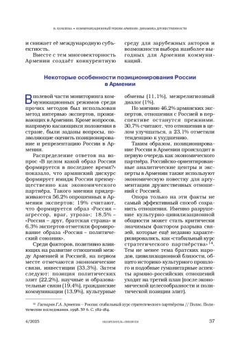 2. Атанесян А. В., Мкртичян А. Е. Россия как союзник: динамика восприятия в армянском обществе до и после карабахской войны 2020 года // Полис. Политические исследования. 2023. № 2. С. 9-26.