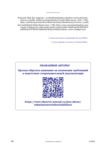 В статье рассмотрена политика Китая по редкоземельным металлам в Африке как элемент его глобальной стратегии обеспечения доступа к критически важным ресурсам. Анализируются значимость редкоземельных металлов для высокотехнологичных отраслей, инвестиционные механизмы КНР, модель «ресурсы в обмен на развитие» и взаимодействие с африканскими государствами.