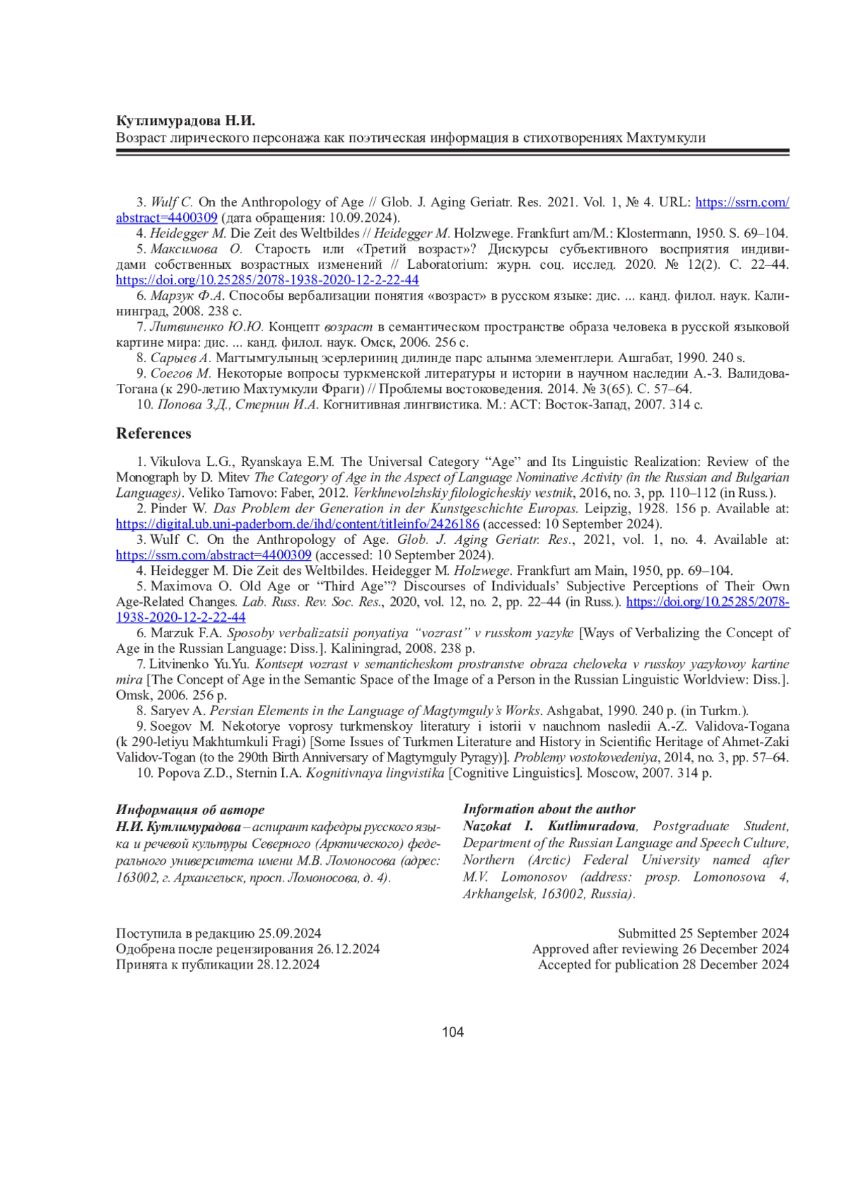 В данной работе рассматривается актуализация категории «возраст» в контексте диалога культур. Материалом служат переведенные на русский язык тексты туркменского классика Фраги Махтумкули. Большинство научных исследований, посвященных творчеству национального поэта, проводится в рамках литературоведения, переводоведения и философии. Филологические труды рассматривают, в частности, стилистические особенности и заимствования. Изучение наследия поэта актуально в связи с его 300-летним юбилеем. Автор статьи анализирует примеры абсолютного и условного возрастов, характеризует языковые средства выражения возраста в текстах сборника стихотворений Махтумкули. Приводит обозначения возрастных периодов в туркменской картине мира и проводит их количественный анализ на поэтическом материале. Уделяет внимание метафоре со значением возраста. Отмечает универсальность категории «возраст», подтверждая это примерами из текстов туркменского поэта. Особое место отводит автобиографическим стихотворениям. Согласно количественному анализу, в 95 из 274 стихотворений сборника присутствуют слова и словосочетания с семантикой возраста. Наиболее частотной лексемой с обозначением возраста является лексема «джигит», которая имеет множество значений. Это слово в контексте стихотворений Махтумкули содержит мелиоративную и пейоративную оценки. Данная работа позволяет рассмотреть индивидуальную картину мира туркменского мыслителя и специфику туркменской лингвокультуры, дает возможность ознакомиться с восприятием старости и юности у туркмен. Особо важными у Махтумкули являются сравнительные конструкции, в частности лирическая героиня сравнивается с молодой двухнедельной луной, что характерно для туркменской культуры. Среди примеров встречаются конструкции, подтверждающие линейность времени. В целом стихотворения туркменского поэта отражают его религиозную картину мира.