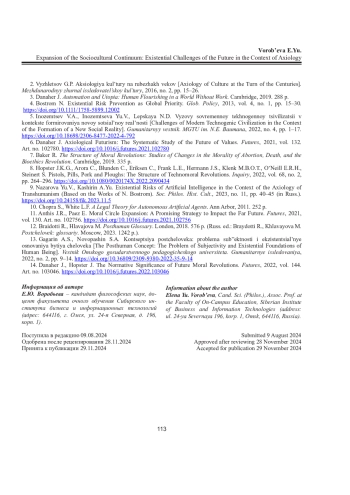 5. Иноземцев В.А., Иноземцева Ю.В., Лепская Н.Д. Вызовы современной техногенной цивилизации в контексте формирования новой социальной реальности // Гуманит. вестн. МГТУ им. Н.Э. Баумана. 2022. No 4 (96). С. 1-17. DOI: 10.18698/2306-8477-2022-4-792
