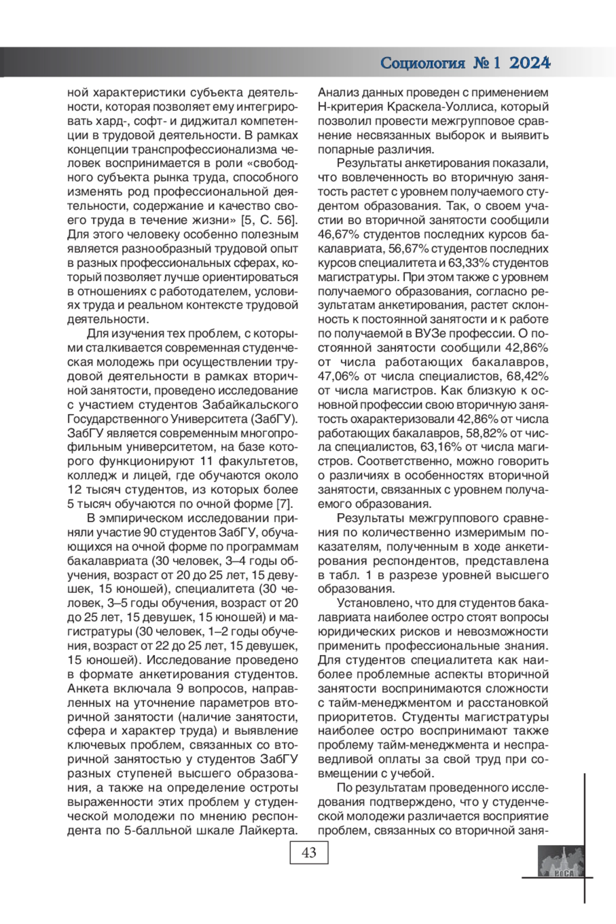 МИХАЙЛОВСКАЯ С. А. СТРУКТУРНЫЕ ОГРАНИЧЕНИЯ ФОРМИРОВАНИЯ ПРОФЕССИОНАЛЬНЫХ КОМПЕТЕНЦИЙ В УСЛОВИЯХ ВТОРИЧНОЙ ЗАНЯТОСТИ СТУДЕНЧЕСКОЙ МОЛОДЕЖИ (НА МАТЕРИАЛАХ ЗАБГУ) // СОЦИОЛОГИЯ. 2024. № 1