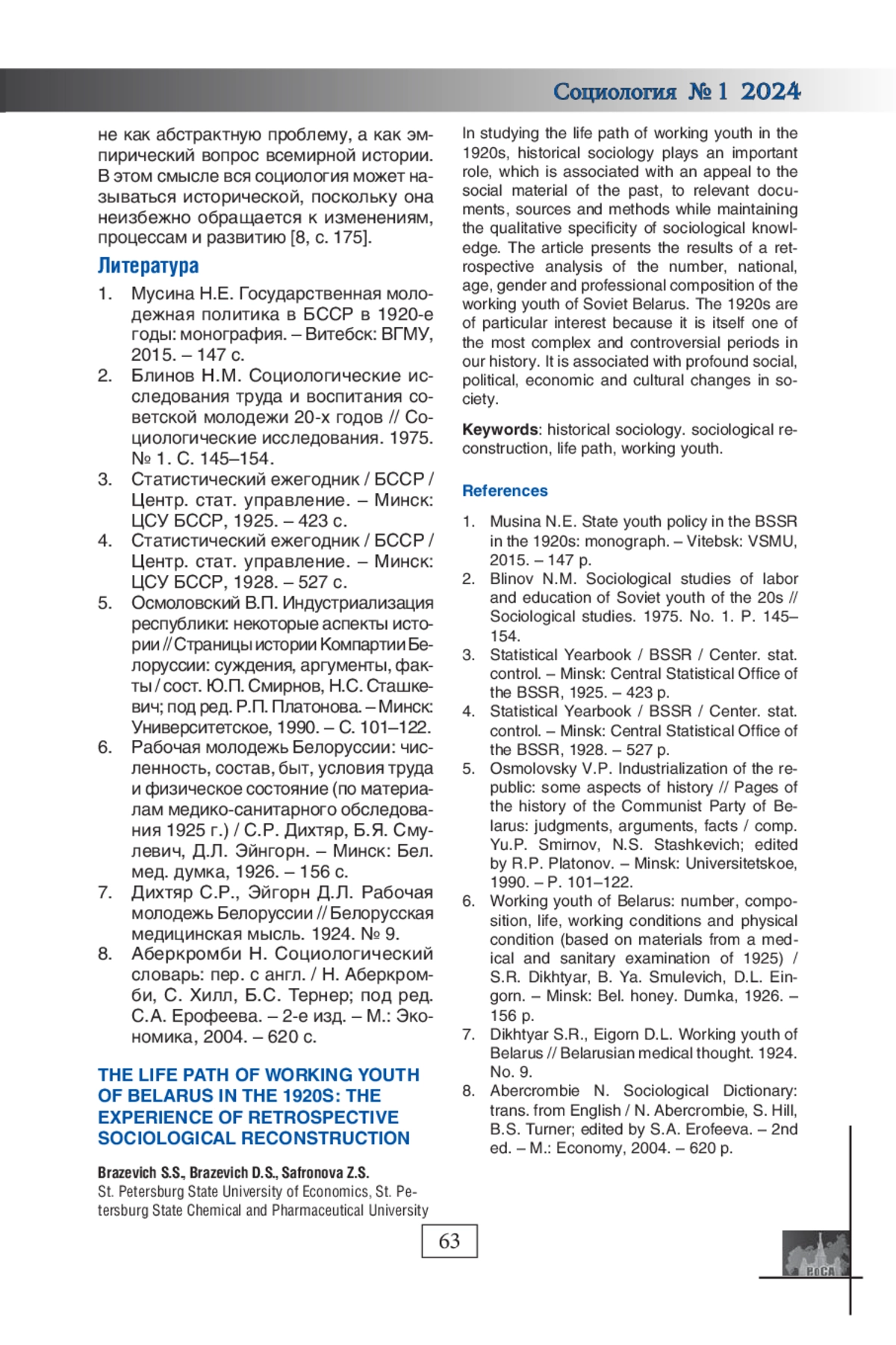 2. Блинов Н.М. Социологические исследования труда и воспитания советской молодежи 20-х годов // Социологические исследования. 1975. № 1. С. 145-154. EDN: WKIVCI