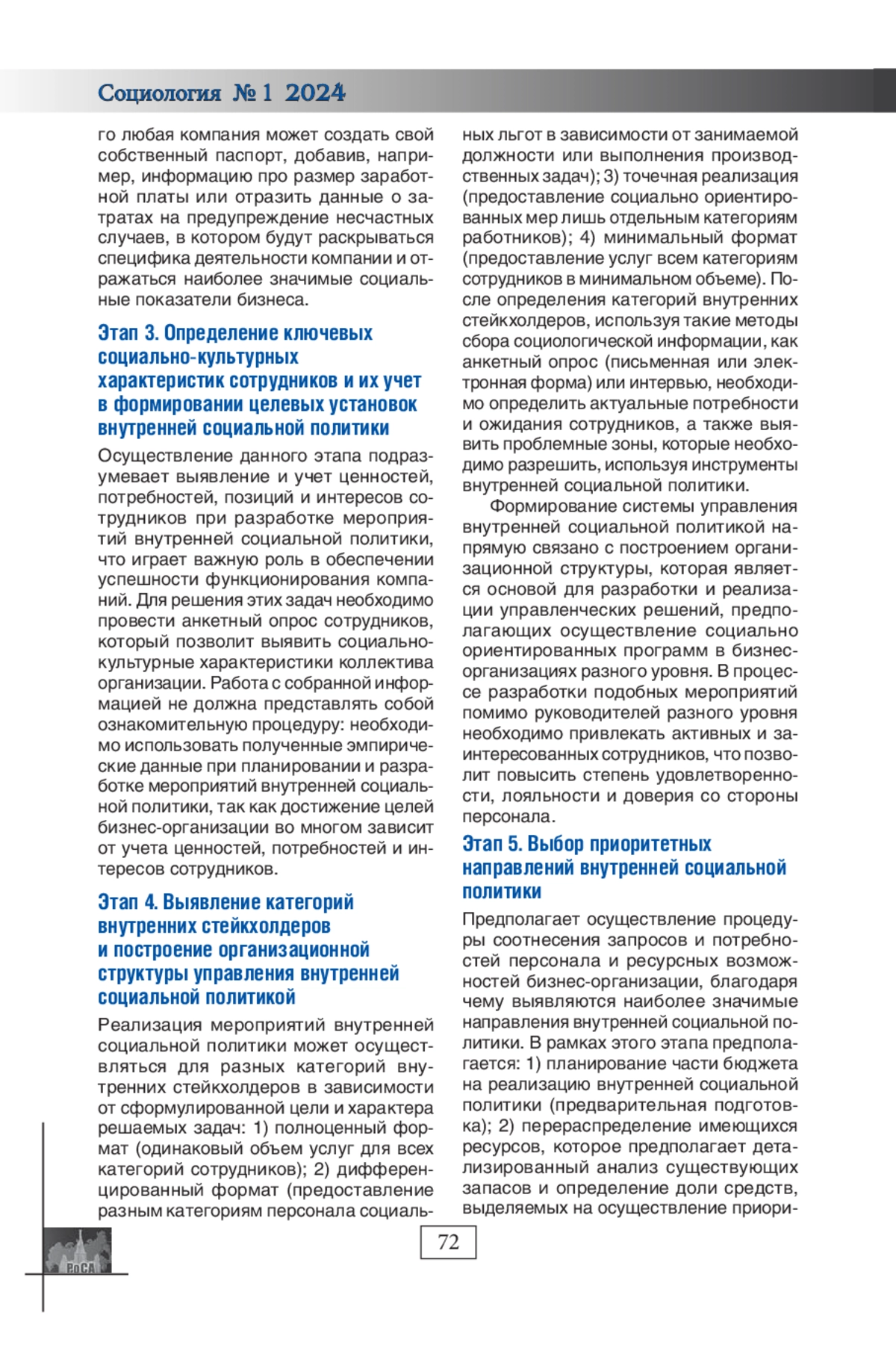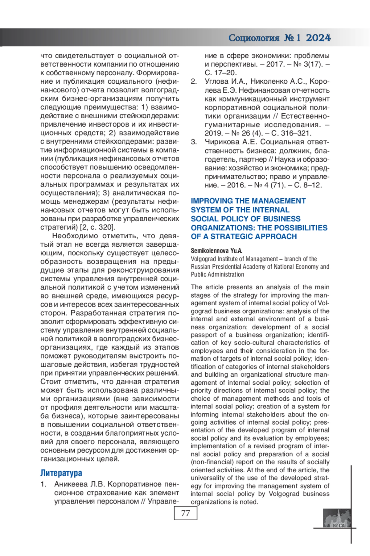 В статье представлен анализ основных этапов стратегии совершенствования системы управления внутренней социальной политикой волгоградских бизнес-организаций: анализ внутренней и внешней среды бизнесорганизации; разработка социального паспорта бизнес-организации; определение ключевых социально-культурных характеристик сотрудников и их учет в формировании целевых установок внутренней социальной политики; выявление категорий внутренних стейкхолдеров и построение организационной структуры управления внутренней социальной политикой; выбор приоритетных направлений внутренней социальной политики; выбор методов управления и инструментов внутренней социальной политики; создание системы информирования внутренних стейкхолдеров о реализуемых мероприятиях внутренней социальной политики; презентация разработанной программы внутренней социальной политики и её оценка сотрудниками; реализация доработанной программы внутренней социальной политики и подготовка социального (нефинансового) отчета по результатам социально ориентированной деятельности. В конце статьи отмечена универсальность использования разработанной стратегии совершенствования системы управления внутренней социальной политикой волгоградскими бизнес-организациями.