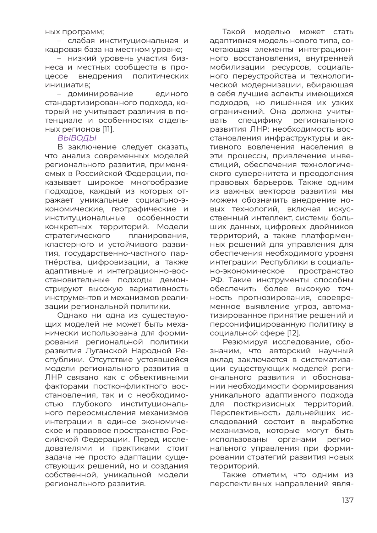 В статье рассмотрены современные модели региональной политики, применяемые в условиях новой социально-экономической реальности на примерах регионов Российской Федерации. Проведён сравнительный анализ стратегического, инновационно-кластерного, устойчивого, социально-ориентированного, инвестиционно-промышленного, цифрового и других подходов к региональному развитию. Особое внимание уделено возможности адаптации указанных моделей в специфических условиях Луганской Народной Республики с акцентом на необходимость создания собственной адаптивной модели, сочетающей в себе элементы интеграционного восстановления, цифровой трансформации и технологической модернизации. Подчёркивается значение внедрения искусственного интеллекта и цифровых решений для повышения эффективности регионального управления.