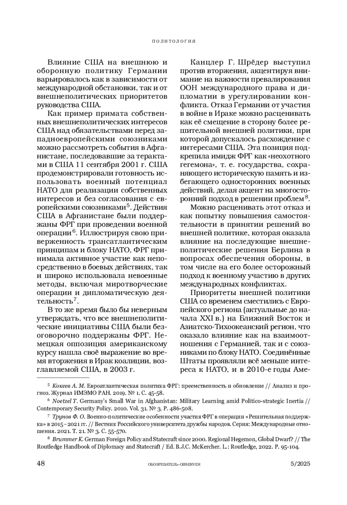 АГАФОНОВА О. В. АМЕРИКАНСКИЙ ФАКТОР В СОВРЕМЕННОЙ ОБОРОННОЙ ПОЛИТИКЕ ФРГ // ОБОЗРЕВАТЕЛЬ. 2025. № 5