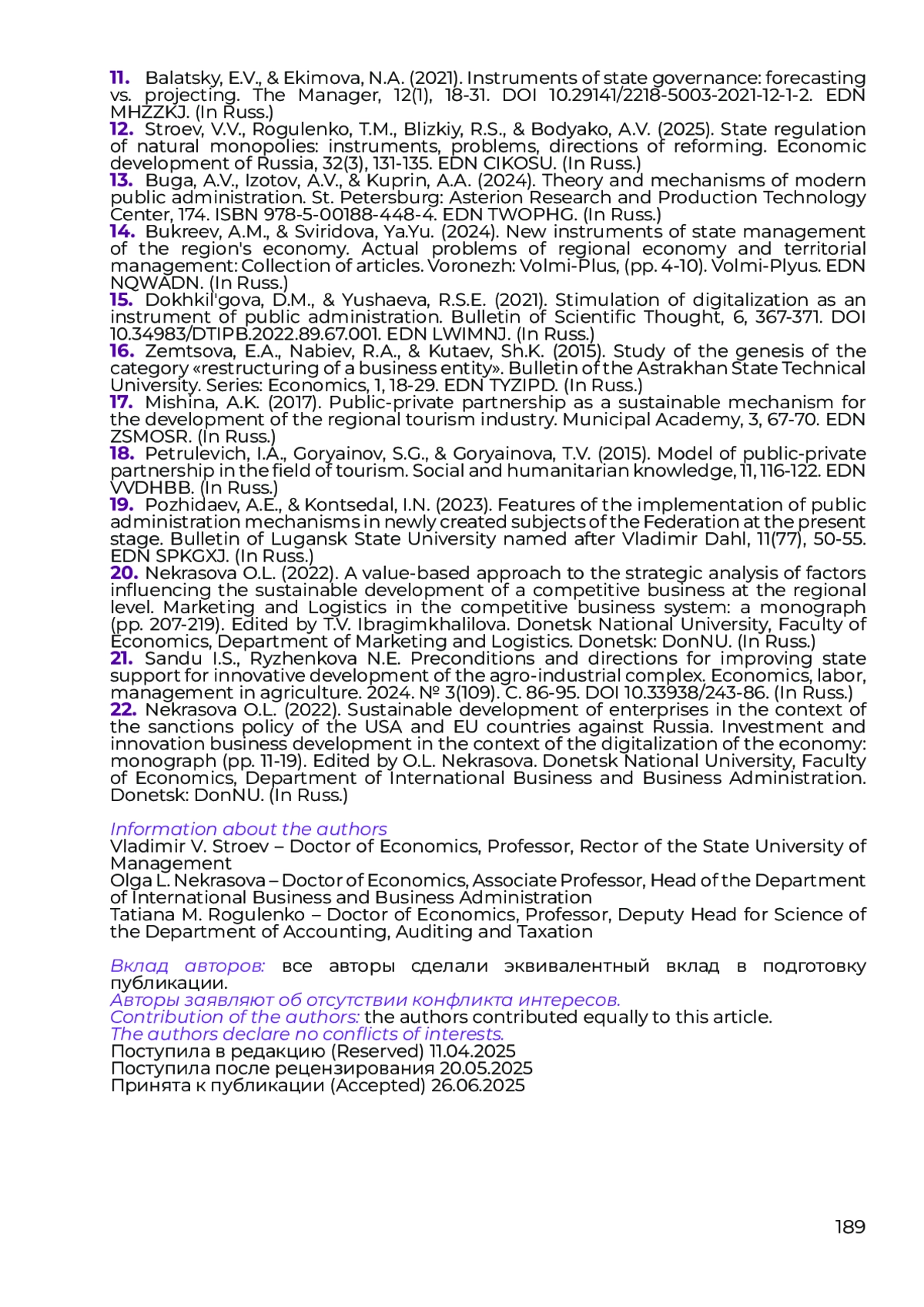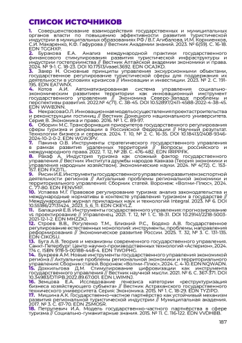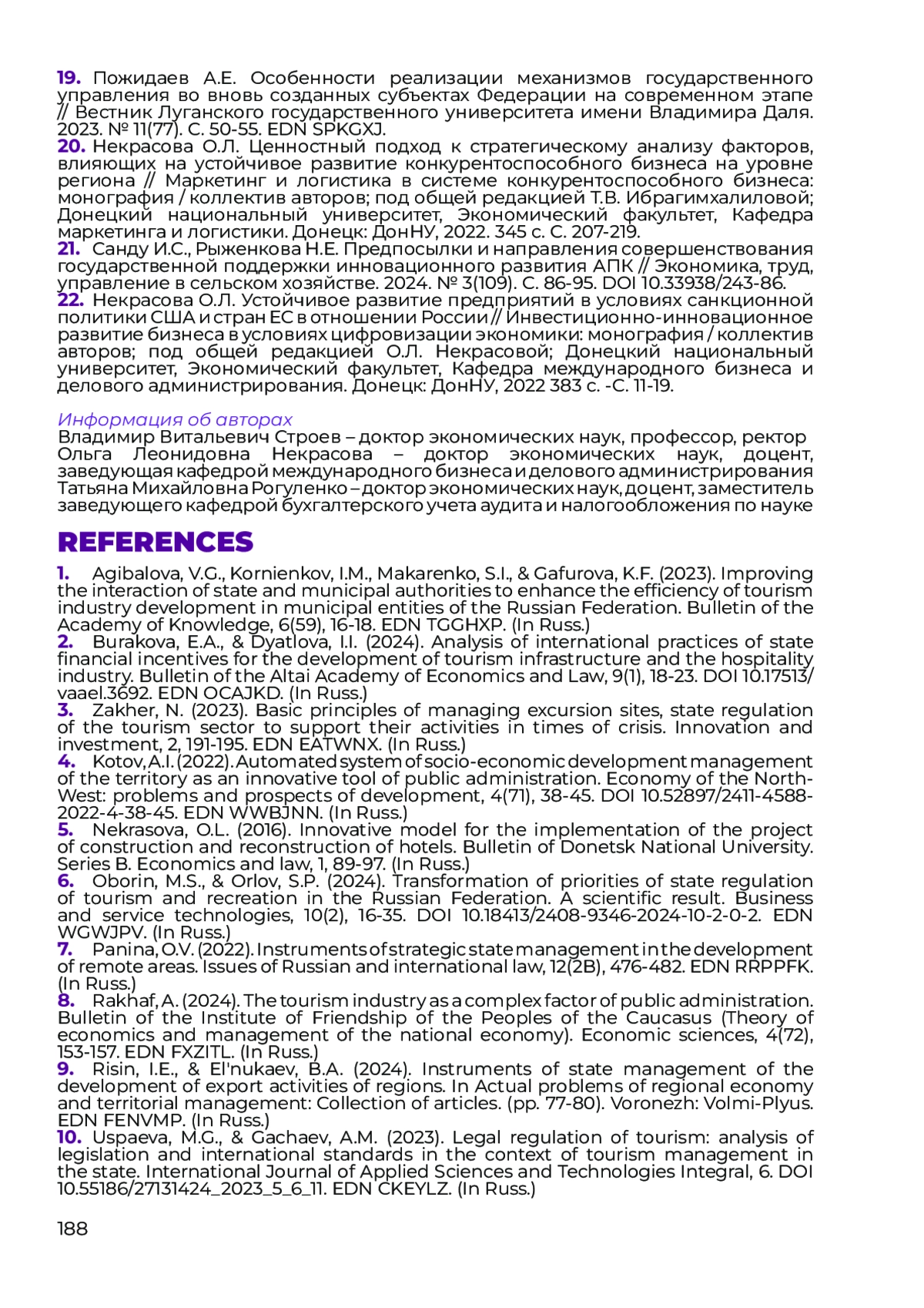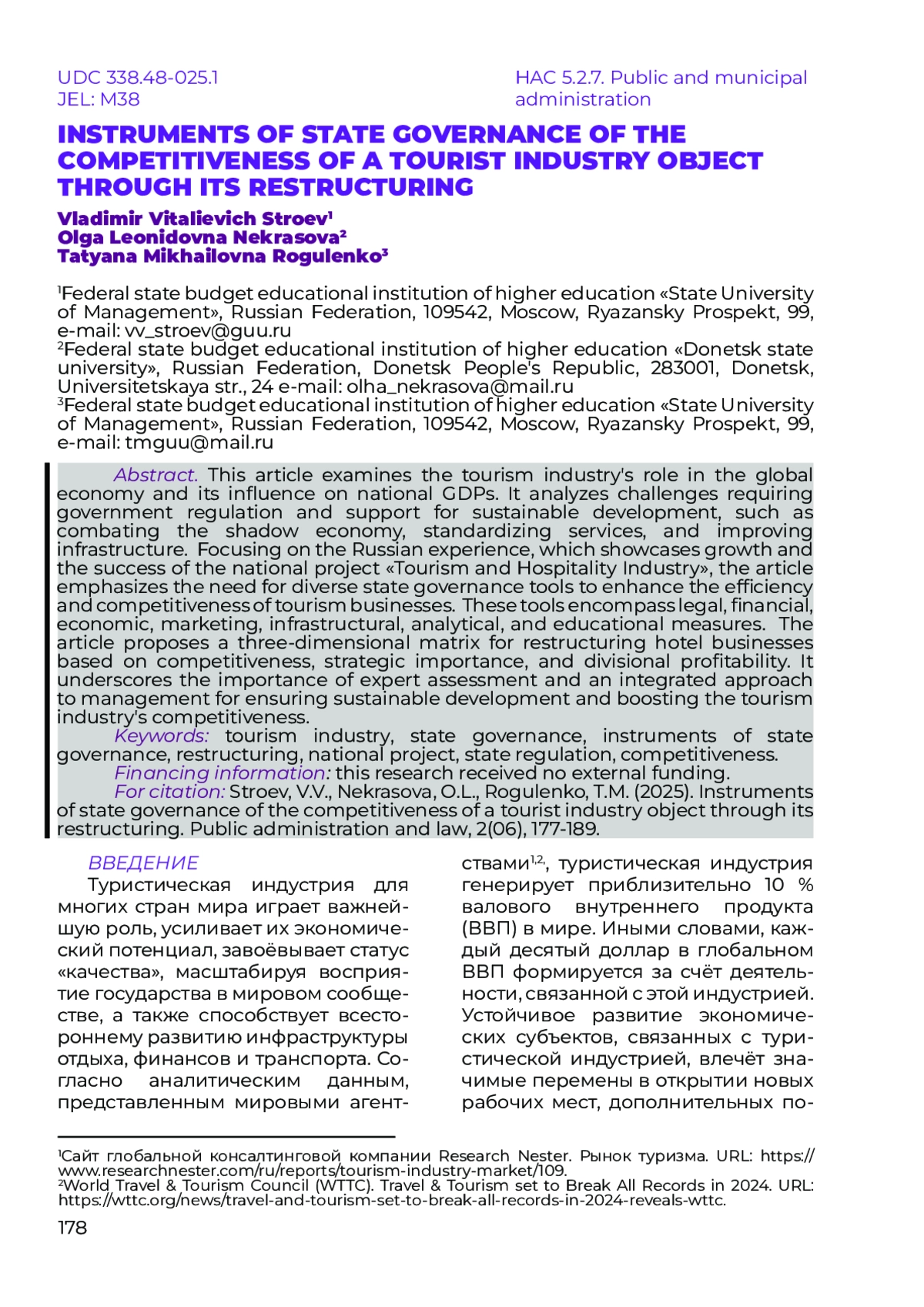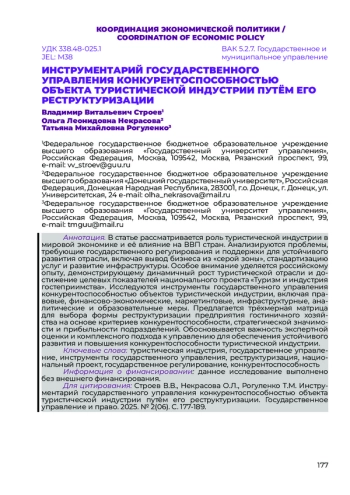 СТРОЕВ В. В., НЕКРАСОВА О. Л., РОГУЛЕНКО Т. М. ИНСТРУМЕНТАРИЙ ГОСУДАРСТВЕННОГО УПРАВЛЕНИЯ КОНКУРЕНТОСПОСОБНОСТЬЮ ОБЪЕКТА ТУРИСТИЧЕСКОЙ ИНДУСТРИИ ПУТЁМ ЕГО РЕСТРУКТУРИЗАЦИИ // НАУЧНЫЙ ЖУРНАЛ "ГОСУДАРСТВЕННОЕ УПРАВЛЕНИЕ И ПРАВО". 2025. № 2 (6)