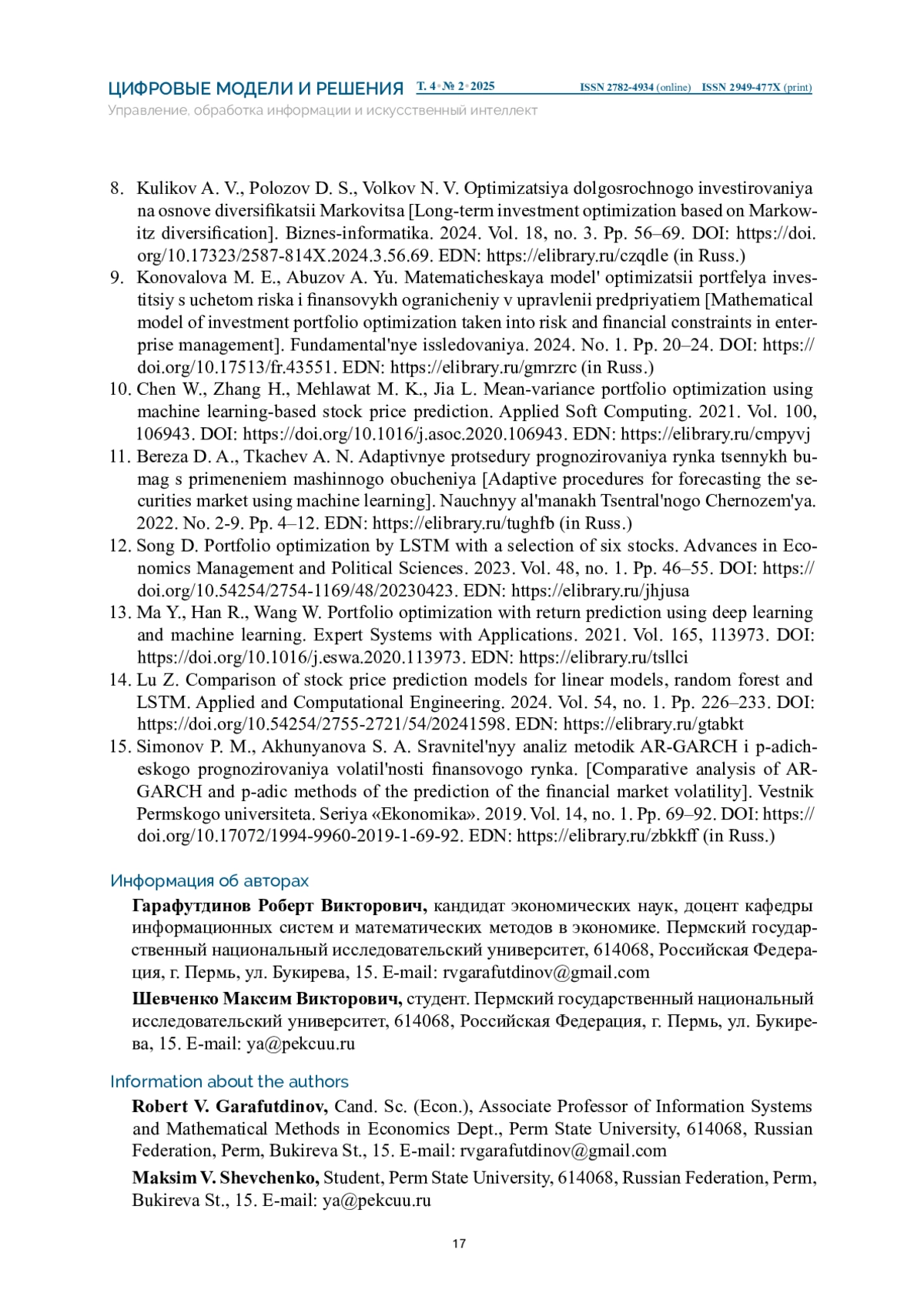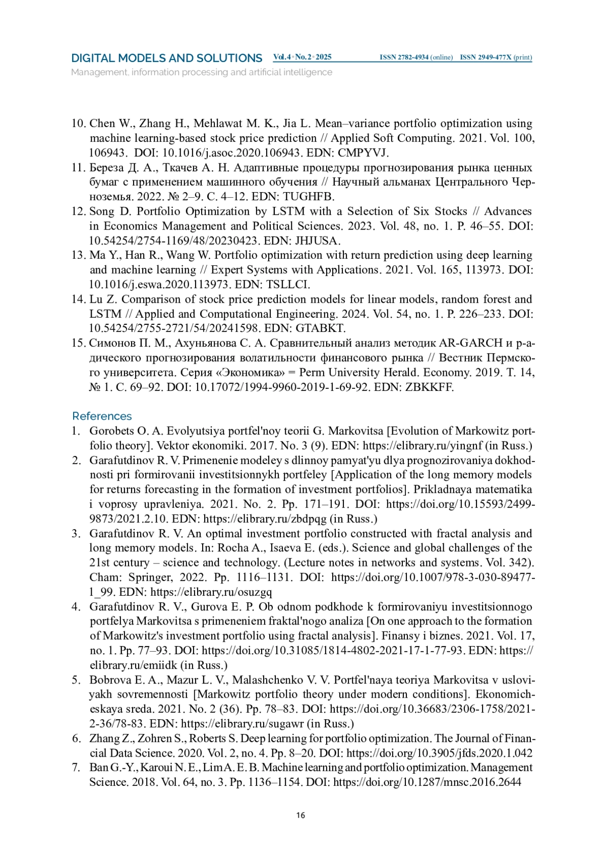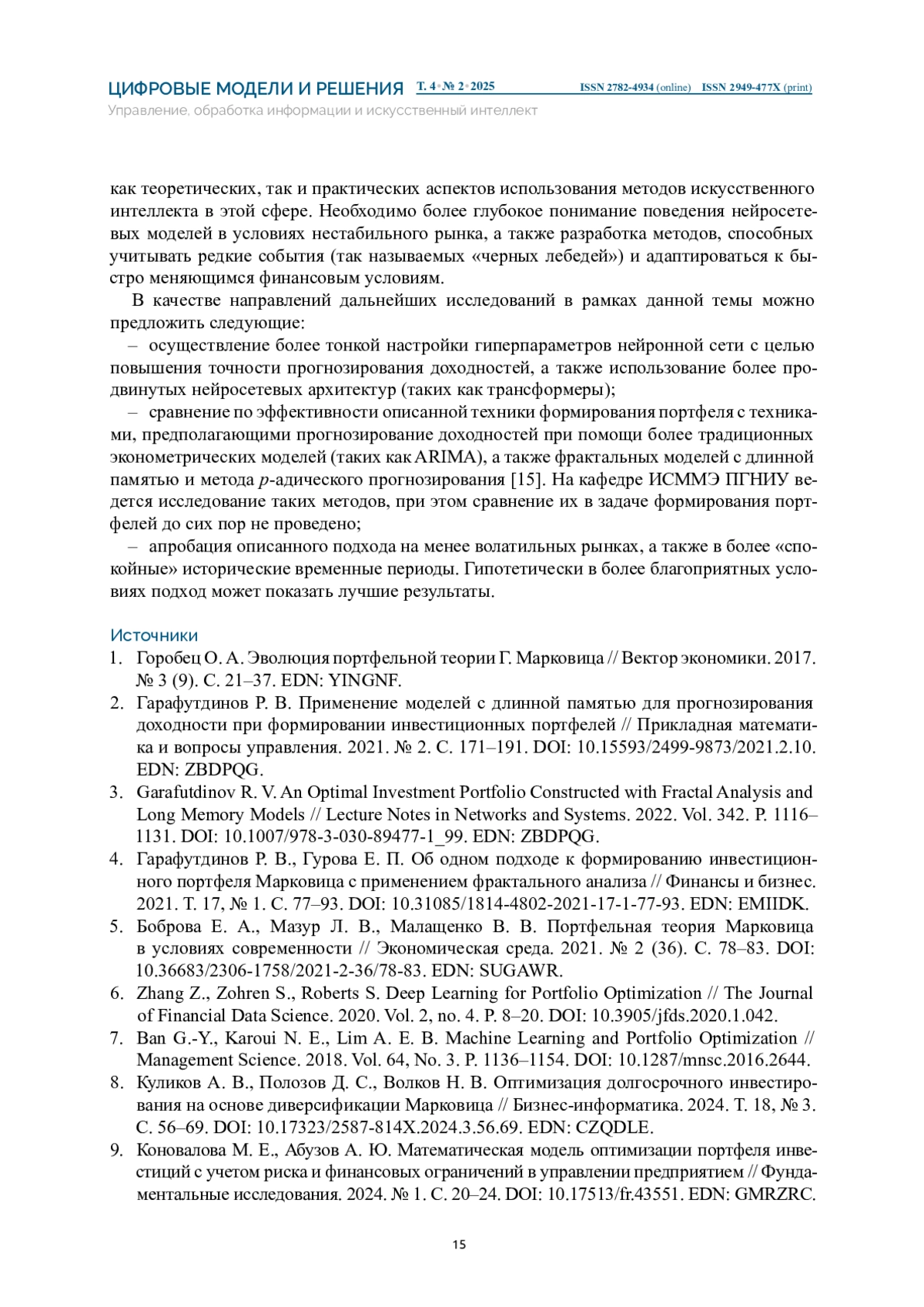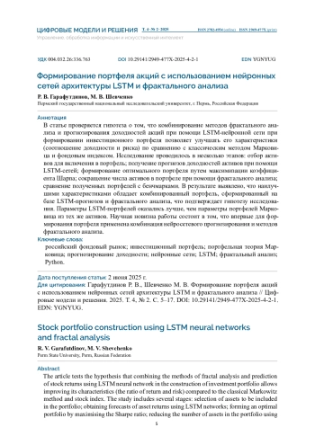 ГАРАФУТДИНОВ Р. В., ШЕВЧЕНКО М. В. ФОРМИРОВАНИЕ ПОРТФЕЛЯ АКЦИЙ С ИСПОЛЬЗОВАНИЕМ НЕЙРОННЫХ СЕТЕЙ АРХИТЕКТУРЫ LSTM И ФРАКТАЛЬНОГО АНАЛИЗА // ЦИФРОВЫЕ МОДЕЛИ И РЕШЕНИЯ. 2025. Т. 4 № 2