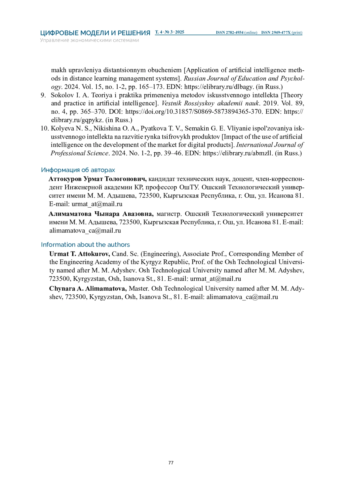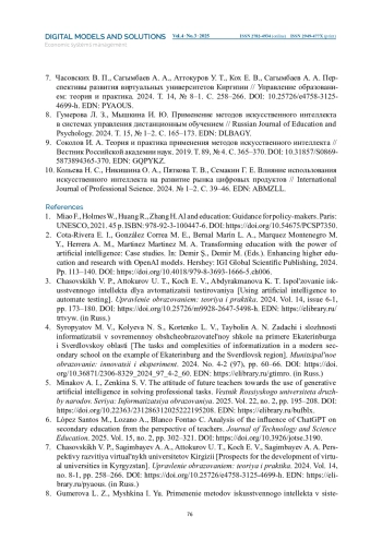 8. Гумерова Л. З., Мышкина И. Ю. Применение методов искусственного интеллекта в системах управления дистанционным обучением // Russian Journal of Education and Psychology. 2024. Т. 15, № 1-2. С. 165-173. EDN: DLBAGY