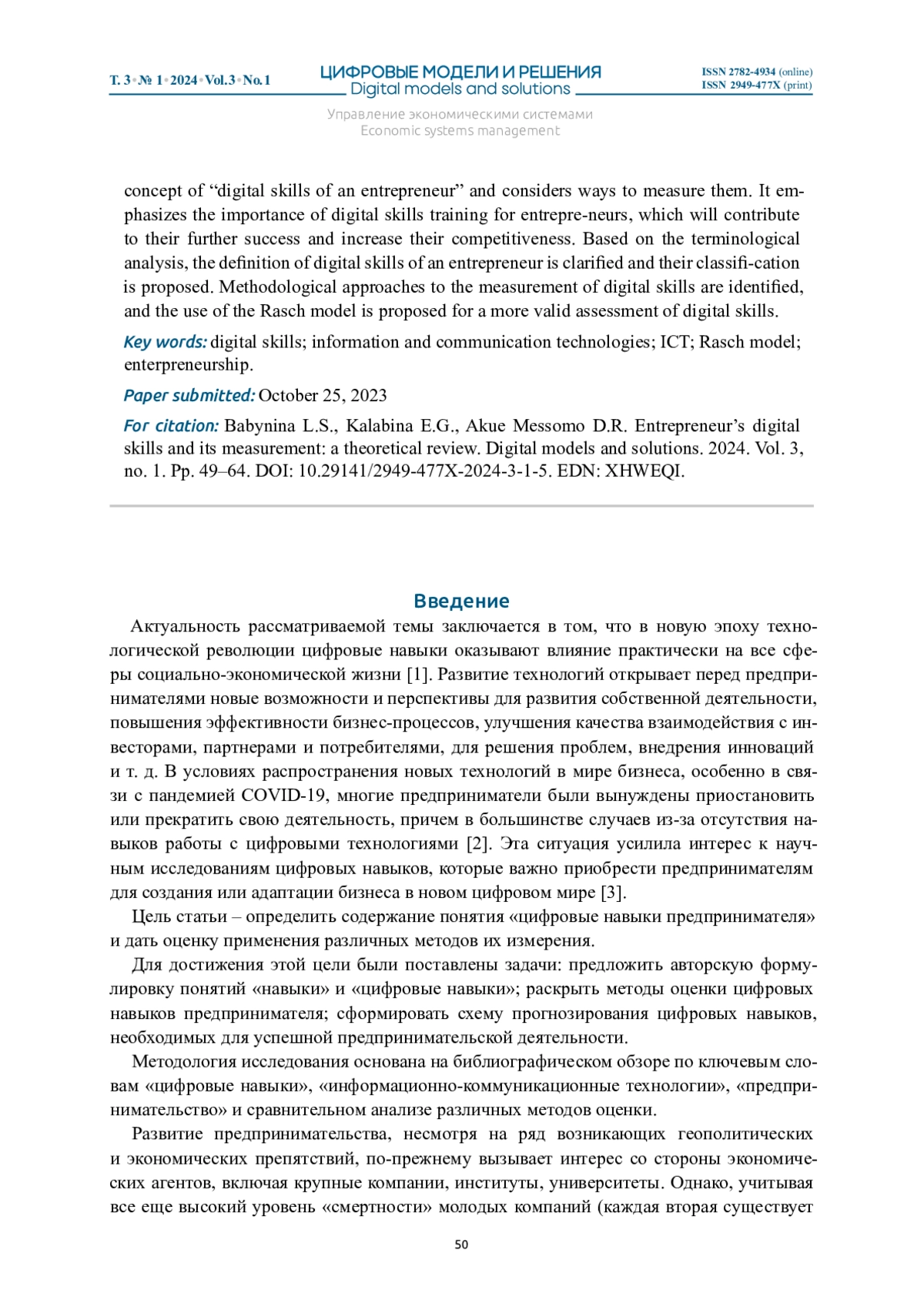 Среди актуальных проблем развития предпринимательства в России на первый план выходят вопросы достаточности компетенций и навыков предпринимателя для работы в новой информационно-коммуникационной среде. В статье раскрывается понятие «цифровые навыки предпринимателя», рассматриваются способы их измерения. Подчеркивается важность приобретения предпринимателями цифровых навыков, которые будут способствовать их дальнейшей успешной деятельности и повышению конкурентоспособности. На основании терминологического анализа уточнено определение цифровых навыков предпринимателя, предложена их классификация. Раскрыты методические подходы к измерению цифровых навыков, для более достоверной их оценки предложено применение модели Раша