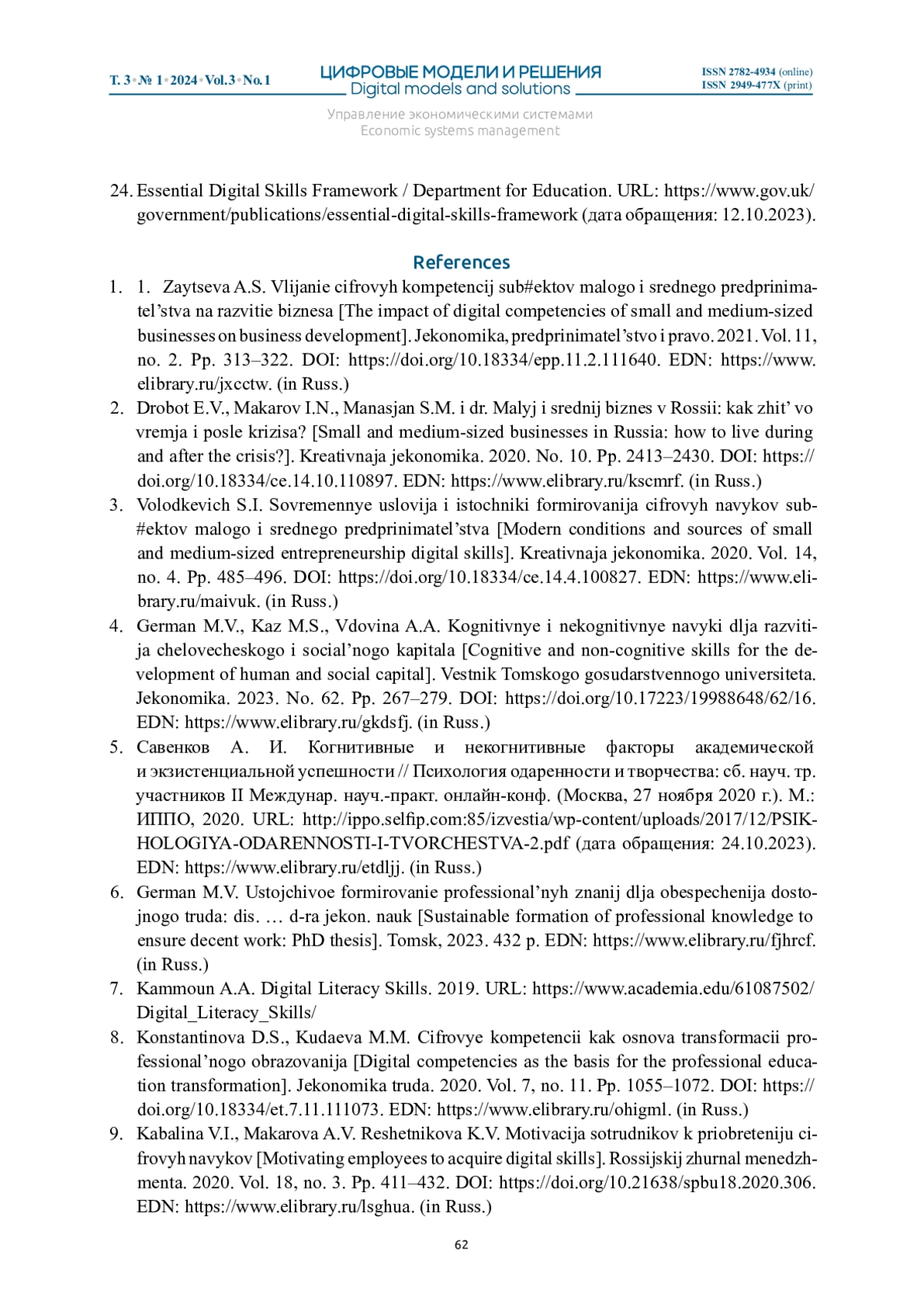 1. Зайцева А.С. Влияние цифровых компетенций субъектов малого и среднего предпринимательства на развитие бизнеса // Экономика, предпринимательство и право. 2021. Т. 11, № 2. С. 313-322. DOI: 10.18334/epp.11.2.111640 EDN: JXCCTW