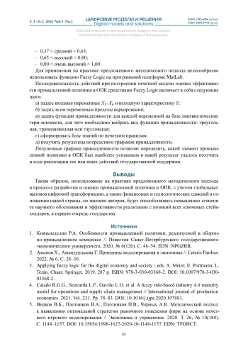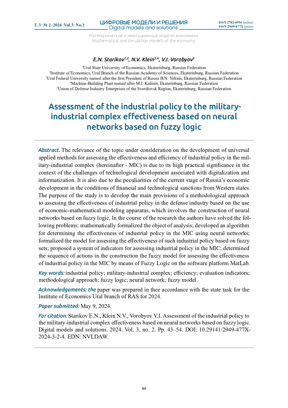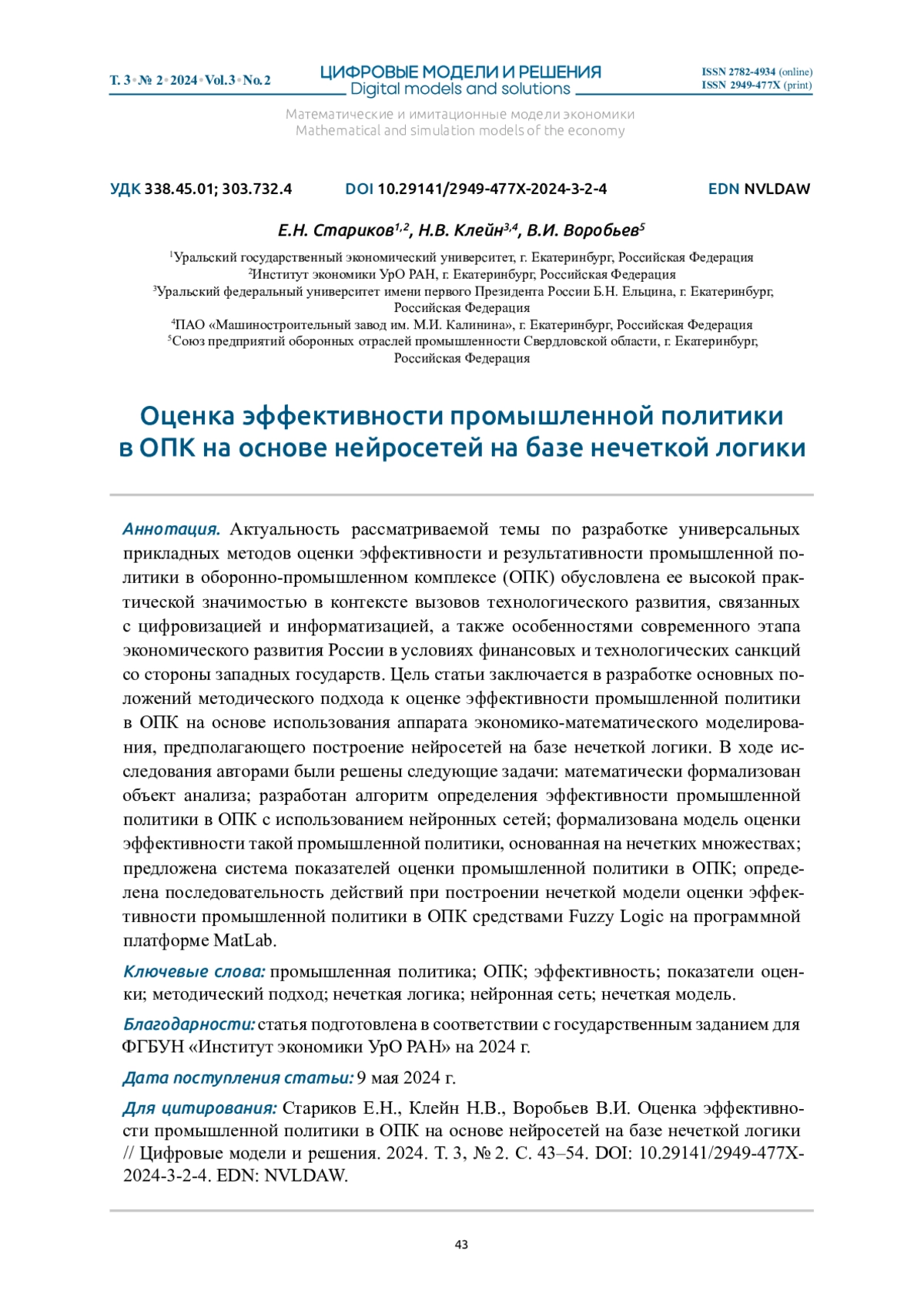 СТАРИКОВ Е. Н., КЛЕЙН Н. В., ВОРОБЬЕВ В. И. ОЦЕНКА ЭФФЕКТИВНОСТИ ПРОМЫШЛЕННОЙ ПОЛИТИКИ В ОПК НА ОСНОВЕ НЕЙРОСЕТЕЙ НА БАЗЕ НЕЧЕТКОЙ ЛОГИКИ // ЦИФРОВЫЕ МОДЕЛИ И РЕШЕНИЯ. 2024. Т. 3 № 2