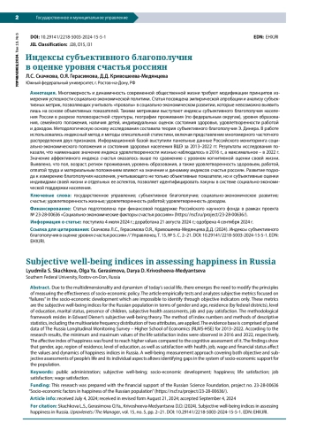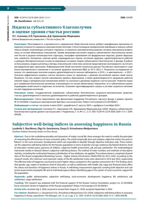 Многомерность и динамичность современной общественной жизни требуют модификации принципов измерения успешности социально-экономической политики. Статья посвящена эмпирической апробации и анализу субъективных метрик, позволяющих учитывать «провалы» в социально-экономическом развитии, которые невозможно выявить лишь на основе объективных показателей. Такими метриками выступают индексы субъективного благополучия населения России в разрезе половозрастной структуры, географии проживания (по федеральным округам), уровня образования, семейного положения, наличия детей, индивидуальных оценок состояния здоровья, удовлетворенности работой и доходом. Методологическую основу исследования составила теория субъективного благополучия Э. Динера. В работе использовались индексный метод и методы описательной статистики, включая представление многомерного частотного распределения двух признаков. Информационной базой выступили панельные данные Российского мониторинга социально-экономического положения и состояния здоровья населения ВШЭ за 2013–2022 гг. Результаты исследования показали, что наименьшее значение индекса удовлетворенности жизнью наблюдалось в 2016 г., а максимальное – в 2022 г. Значение аффективного индекса счастья оказалось выше по сравнению с уровнем когнитивной оценки своей жизни. Выявлено, что пол, возраст, регион проживания, уровень образования, а также удовлетворенность здоровьем, работой, оплатой труда и материальным положением влияют на значение и динамику индексов счастья россиян. Развитие подхода к измерению благополучия населения, учитывающего не только объективные показатели, но и субъективные оценки индивидами своей жизни и отдельных ее аспектов, позволяет идентифицировать лакуны в системе социально-экономической поддержки населения