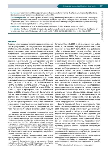 Внешние коммуникации являются важной составляющей корпоративных систем управления информацией [Телегин, 2022; Щербаченко, 2018], опосредующей взаимоотношения с инвесторами, бизнес-партнерами, кредиторами, саморегулируемыми организациями и другими лицами, как зависящими от решений и действий компании, так и оказывающими влияние на ее решения и действия, то есть заинтересованными сторонами (стейкхолдерами)1 [Freeman, 1984, р. 58]. Поиск общего консенсуса и задачу выстраивания конструктивного диалога с наиболее весомыми для публичных компаний стейкхолдерами, прежде всего инвесторами, существенно усложняют вариативность и объемность этой аудитории.