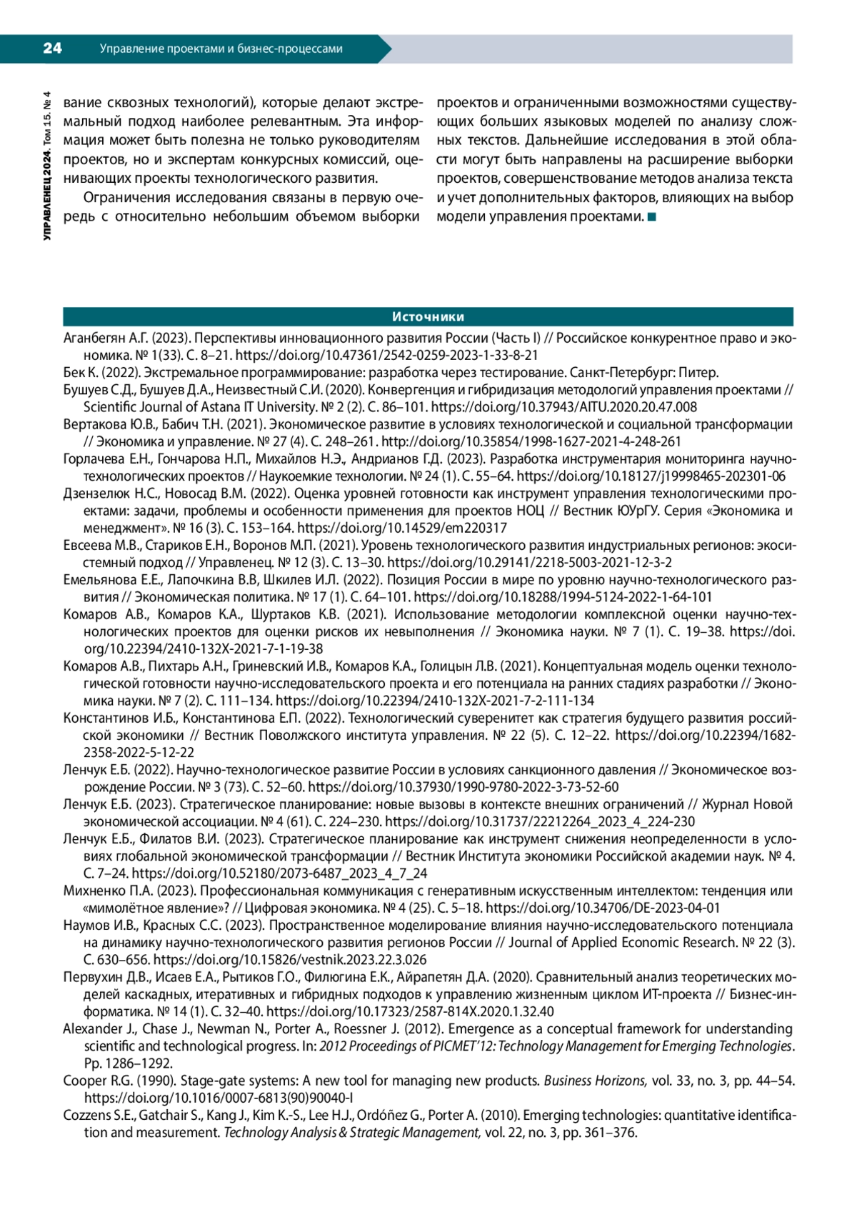 Обеспечение устойчивого социально-экономического развития России в условиях новых вызовов требует поиска эффективных подходов к управлению технологическими проектами. Эта задача приобретает особую актуальность в контексте достижения технологического суверенитета страны и развития приоритетных направлений, обозначенных в Послании Президента РФ Федеральному собранию в 2024 г. К таким направлениям относятся: разработка новых материалов, совершенствование средств производства, внедрение робототехники и беспилотных систем, развитие экономики данных, а также прорывные исследования в области искусственного интеллекта и больших языковых моделей