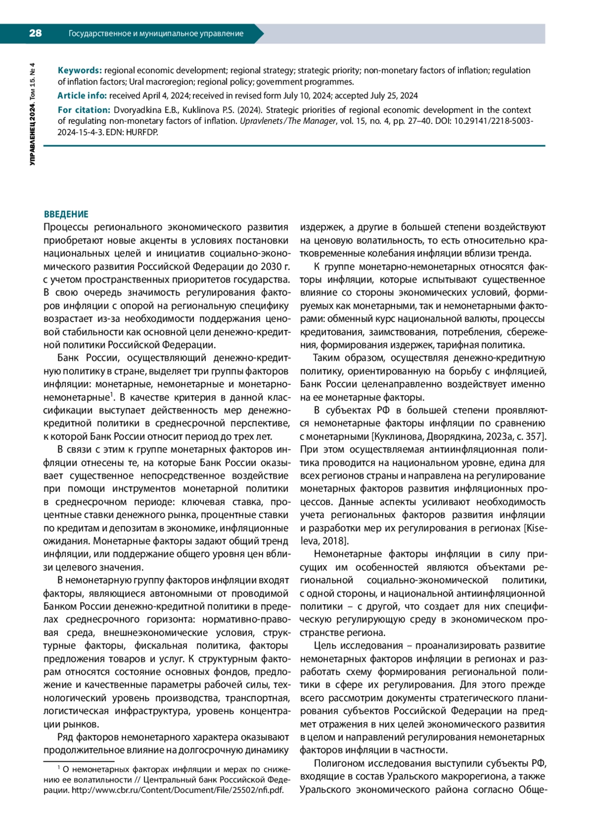 28. Kiseleva P.S. (2018). Regional inflation in Russia and ways of controlling it. R-Economy, vol. 4, issue 2, pp. 39-43. DOI: 10.15826/recon.2018.4.2.006 EDN: UYPBOA