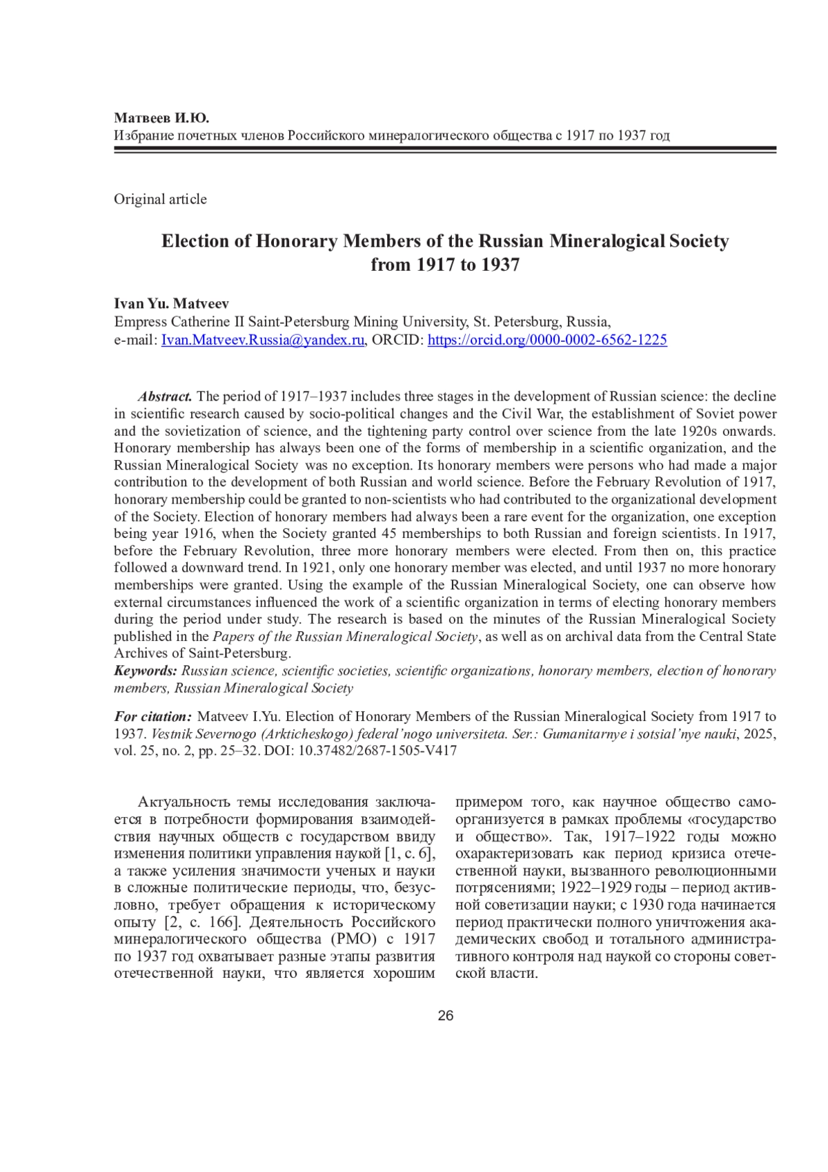 МАТВЕЕВ И. Ю. ИЗБРАНИЕ ПОЧЕТНЫХ ЧЛЕНОВ РОССИЙСКОГО МИНЕРАЛОГИЧЕСКОГО ОБЩЕСТВА С 1917 ПО 1937 ГОД // ВЕСТНИК СЕВЕРНОГО (АРКТИЧЕСКОГО) ФЕДЕРАЛЬНОГО УНИВЕРСИТЕТА. СЕРИЯ: ГУМАНИТАРНЫЕ И СОЦИАЛЬНЫЕ НАУКИ. 2025. Т. 25 № 2
