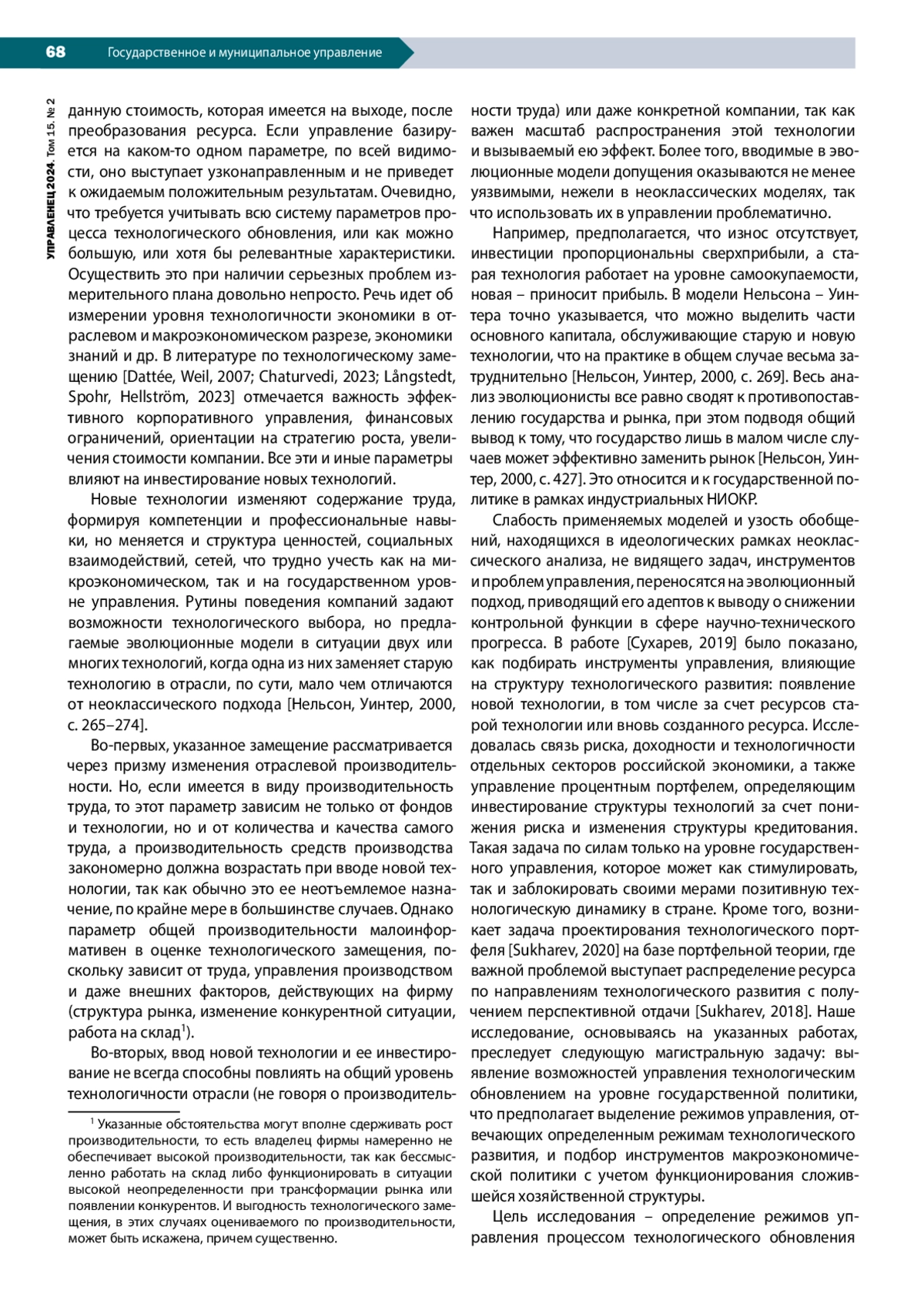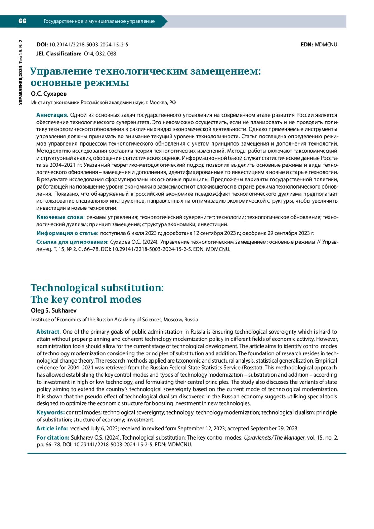 5. Сухарев О.С. (2019). Управление структурой технологического развития: риск и “процентный портфель” // Управленец. Т. 10, № 1. С. 2-15. DOI: 10.29141/2218-5003-2019-10-1-1 EDN: VVOHHN