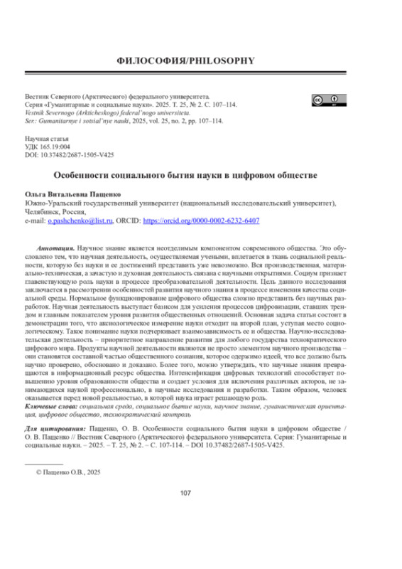 Научное знание является неотделимым компонентом современного общества. Это обусловлено тем, что научная деятельность, осуществляемая учеными, вплетается в ткань социальной реальности, которую без науки и ее достижений представить уже невозможно. Вся производственная, материально-техническая, а зачастую и духовная деятельность связана с научными открытиями. Социум признает главенствующую роль науки в процессе преобразовательной деятельности. Цель данного исследования заключается в рассмотрении особенностей развития научного знания в процессе изменения качества социальной среды. Нормальное функционирование цифрового общества сложно представить без научных разработок. Научная деятельность выступает базисом для усиления процессов цифровизации, ставших трендом и главным показателем уровня развития общественных отношений. Основная задача статьи состоит в демонстрации того, что аксиологическое измерение науки отходит на второй план, уступая место социологическому. Такое понимание науки подчеркивает взаимозависимость ее и общества. Научно-исследовательская деятельность - приоритетное направление развития для любого государства технократического цифрового мира. Продукты научной деятельности являются не просто элементом научного производства - они становятся составной частью общественного сознания, которое одержимо идеей, что все должно быть научно проверено, обосновано и доказано. Более того, можно утверждать, что научные знания превращаются в информационный ресурс общества. Интенсификация цифровых технологий способствует повышению уровня образованности общества и создает условия для включения различных акторов, не занимающихся наукой профессионально, в научные исследования и разработки. Таким образом, человек оказывается перед новой реальностью, в которой наука играет решающую роль.
