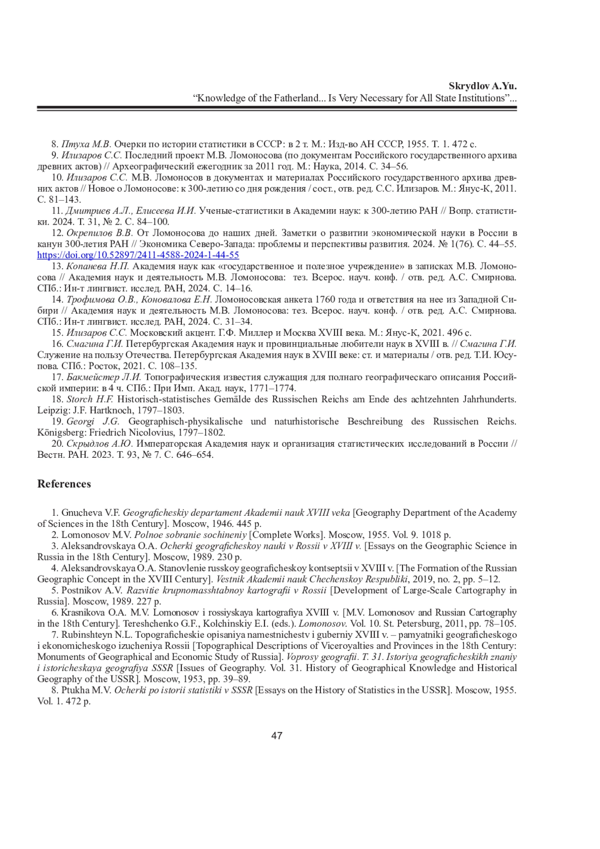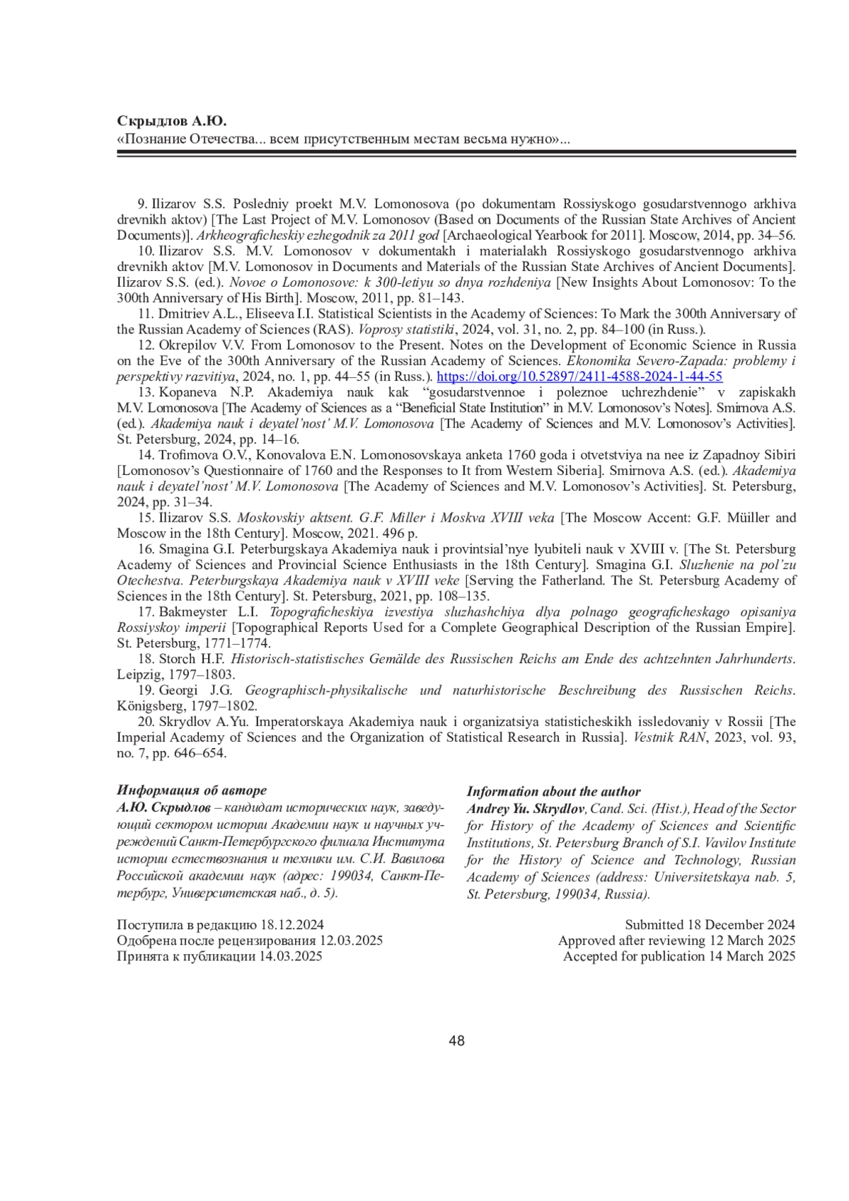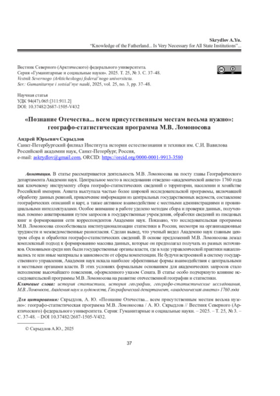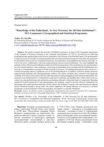 СКРЫДЛОВ А. Ю. «ПОЗНАНИЕ ОТЕЧЕСТВА... ВСЕМ ПРИСУТСТВЕННЫМ МЕСТАМ ВЕСЬМА НУЖНО»: ГЕОГРАФО-СТАТИСТИЧЕСКАЯ ПРОГРАММА М. В. ЛОМОНОСОВА // ВЕСТНИК СЕВЕРНОГО (АРКТИЧЕСКОГО) ФЕДЕРАЛЬНОГО УНИВЕРСИТЕТА. СЕРИЯ: ГУМАНИТАРНЫЕ И СОЦИАЛЬНЫЕ НАУКИ. 2025. Т. 25 № 3
