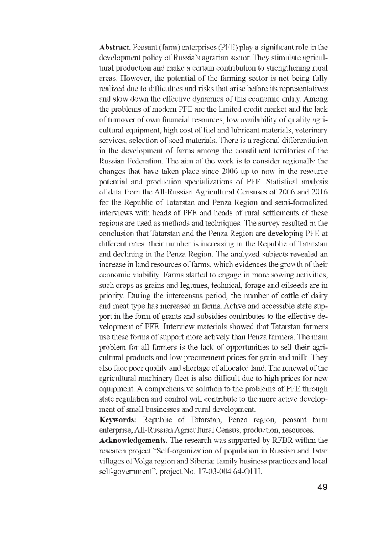 Введение. В политике развития аграрного сектора России значительная роль отводится крестьянским (фермерским) хозяйствам. Они стимулируют сельскохозяйственное производство и вносят определенный вклад в укрепление сельских территорий. Однако потенциал фермерского сектора реализуется не в полной мере, что обусловлено трудностями и рисками, возникающими перед его представителями и замедляющими эффективную динамику данного хозяйствующего субъекта. В числе проблем современных КФХ — ограниченность кредитного рынка и отсутствие оборота собственных финансовых средств, низкая обеспеченность качественной сельскохозяйственной техникой, высокая стоимость ГМС, ветеринарных услуг, селекционных посевных материалов. Среди субъектов РФ прослеживается региональная дифференциация в развитии фермерских хозяйств. Цель работы — рассмотреть в региональном разрезе изменения, произошедшие с 2006 г. до настоящего времени в ресурсном потенциале и в производственных специализациях КФХ. В качестве методов и приемов в работе применяется статистический анализ данных Всероссийских сельскохозяйственных переписей 2006 и 2016 гг. по Республике Татарстан и Пензенской области и полуформализованные интервью с главами КФХ и руководителями сельских поселений данных регионов. Результатом исследования стало заключение о том, что в Татарстане и Пензенской области развитие КФХ идет разными темпами: в республике наблюдается увеличение их численности, а в области — сокращение. В анализируемых субъектах выявлено увеличение земельных ресурсов у фермерских хозяйств, что свидетельствует о росте их экономической состоятельности. Хозяйства стали больше заниматься посевной деятельностью, в приоритете такие культуры, как зерновые и зернобобовые, технические, кормовые и масличные. За межпереписной период в хозяйствах возросло поголовье КРС молочного и мясного направления. Эффективному развитию КФХ способствует активная и доступная государственная поддержка в виде грантов и субсидий. Материалы интервью показали, что татарстанские фермеры активнее используют данные формы поддержки в отличие от пензенских. Основной проблемой для всех фермеров являются отсутствие возможностей для реализации произведенной сельхозпродукции, низкие закупочные цены на зерно и молоко. Сталкиваются они и с низким качеством выделяемых земель и их дефицитом. Сложно идет и обновление парка сельхозтехники в связи с высокими ценами на новую. Комплексное решение проблем КФХ с помощью государственного регулирования и контроля будет способствовать более активному развитию малых форм хозяйствований и развитию сельских территорий.