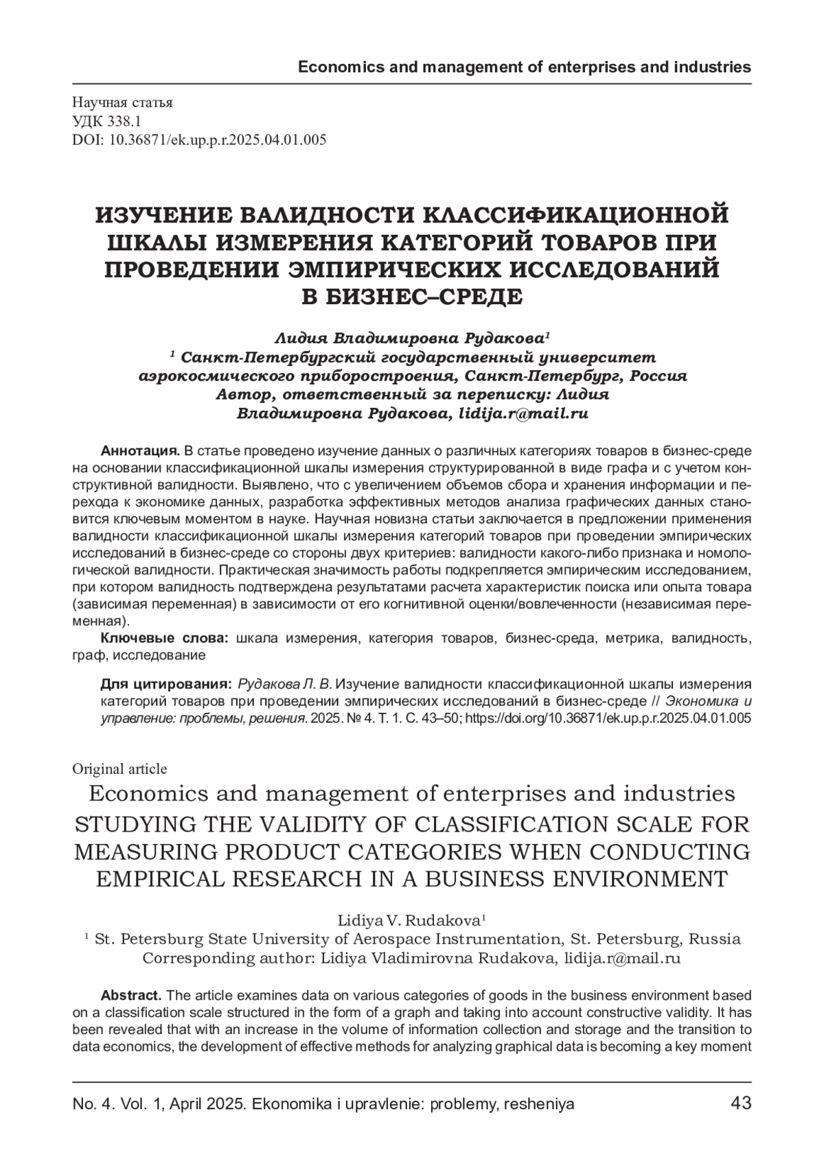 В статье проведено изучение данных о различных категориях товаров в бизнес-среде на основании классификационной шкалы измерения структурированной в виде графа и с учетом конструктивной валидности. Выявлено, что с увеличением объемов сбора и хранения информации и перехода к экономике данных, разработка эффективных методов анализа графических данных становится ключевым моментом в науке. Научная новизна статьи заключается в предложении применения валидности классификационной шкалы измерения категорий товаров при проведении эмпирических исследований в бизнес-среде со стороны двух критериев: валидности какого-либо признака и номологической валидности. Практическая значимость работы подкрепляется эмпирическим исследованием, при котором валидность подтверждена результатами расчета характеристик поиска или опыта товара (зависимая переменная) в зависимости от его когнитивной оценки/вовлеченности (независимая переменная).