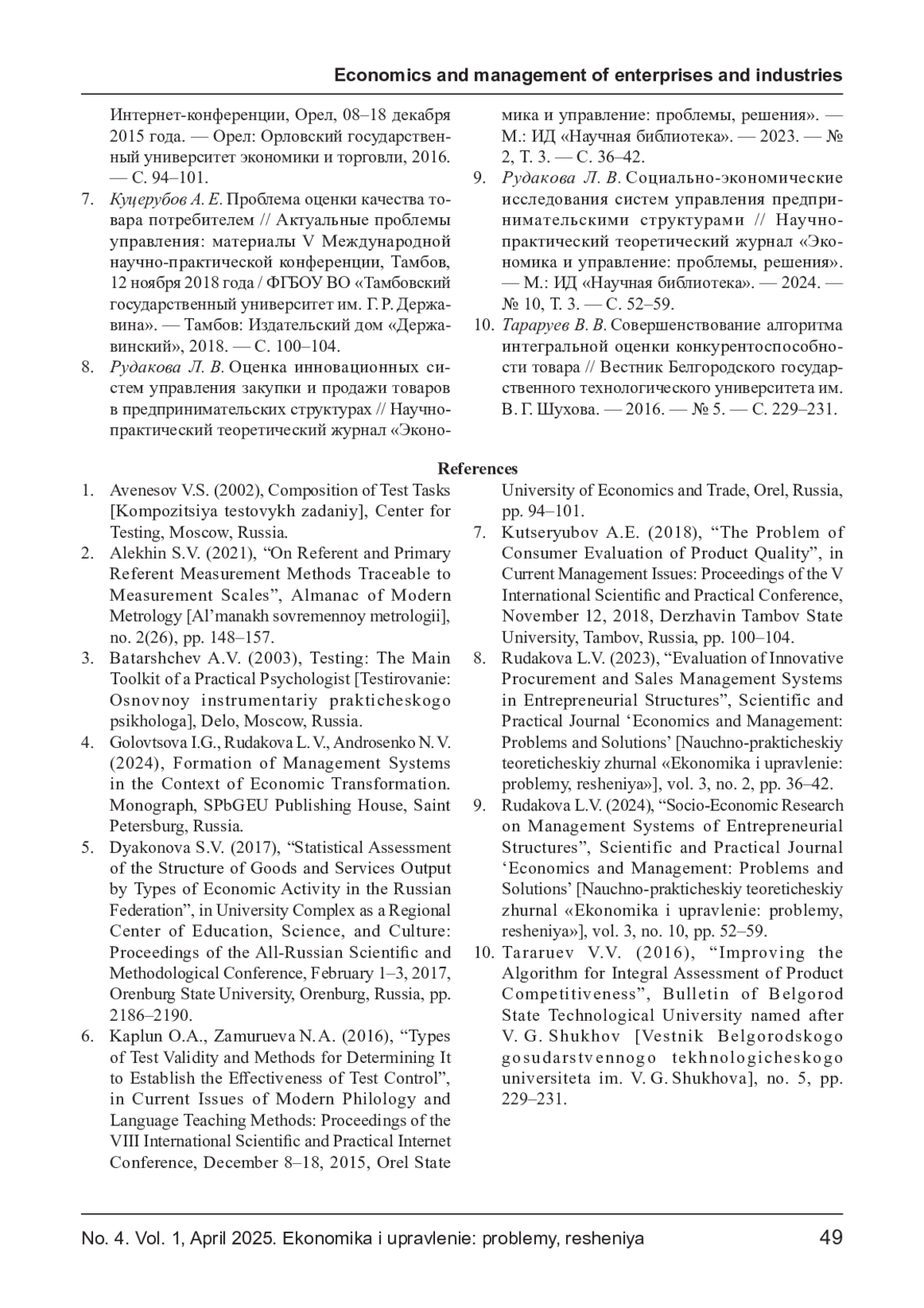 8. Рудакова Л. В. Оценка инновационных систем управления закупки и продажи товаров в предпринимательских структурах // Научно-практический теоретический журнал “Экономика и управление: проблемы, решения”. - М.: ИД “Научная библиотека”. - 2023. - № 2, Т. 3. - С. 36-42.