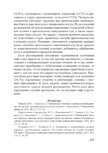 Введение. Культура повседневного питания любого народа складывается в зависимости от традиционного хозяйствования, условия которого предоставляют природно-климатические особенности территории его проживания. В современной культуре питания рельефно наблюдаются, с одной стороны, традиции, сложившиеся «естественным путем» согласно природно-климатическим и территориальным условиям, с другой стороны, фиксируется натиск новых технологий и бытовой техники, удобных для приготовления каждодневной еды (сокращение трудозатрат и времени для приготовления блюд, что немаловажно для современного интенсивного ритма жизни даже в сельской местности). Цель статьи — рассмотреть, какие происходят изменения в культуре повседневного питания сельских семей Якутии, что остается от традиций, какие изменения внесло развитие инфраструктуры в связи с научно-техническими разработками в области обработки, хранения и приготовления продуктов питания в сельскую семейную повседневную кулинарию, распределение обязанностей между членами семьи. Результаты. Показано, что в перспективе, по-видимому, до тех пор, пока часть сельского населения будет заниматься традиционными формами натурального хозяйствования, даже в виде подсобного хозяйства, будет сохраняться традиционная культура повседневного питания — безусловно, в модернизированном виде, претерпевая изменения в технологии переработки и приготовления блюд из натуральных продуктов.