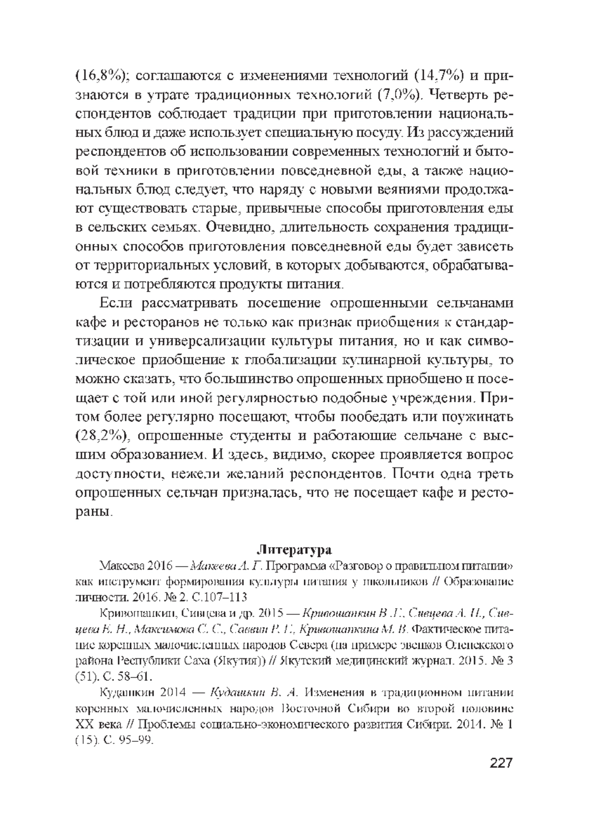 3. Кудашкин В. А. Изменения в традиционном питании коренных малочисленных народов Восточной Сибири во второй половине ХХ века // Проблемы социально-экономического развития Сибири. 2014. № 1 (15). С. 95-99.