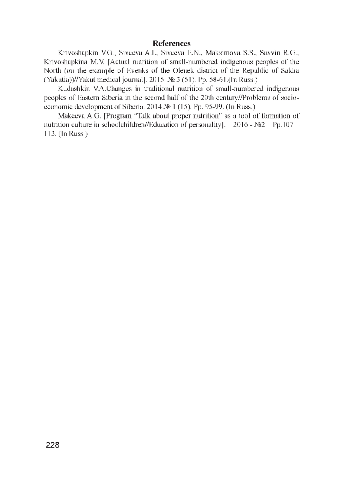 2. Кривошапкин В.Г., Сивцева А. И., Сивцева Е. Н., Максимова С. С., Саввин Р. Г., Кривошапкина М. В. Фактическое питание коренных малочисленных народов Севера (на примере эвенков Оленекского района Республики Саха (Якутия)) // Якутский медицинский журнал. 2015. № 3 (51). С. 58-61.
