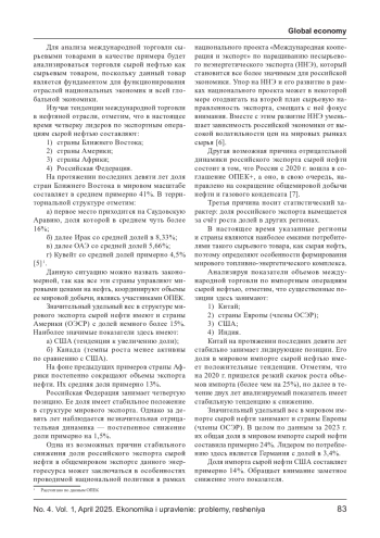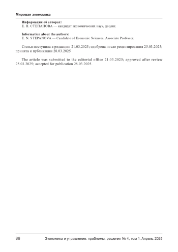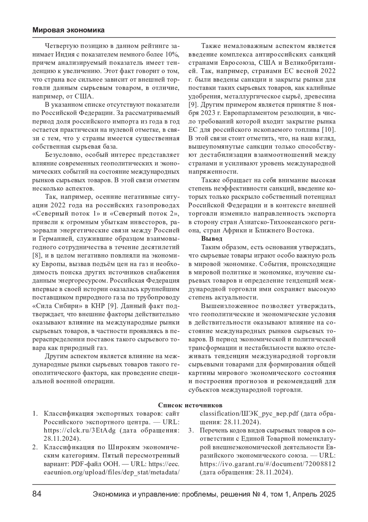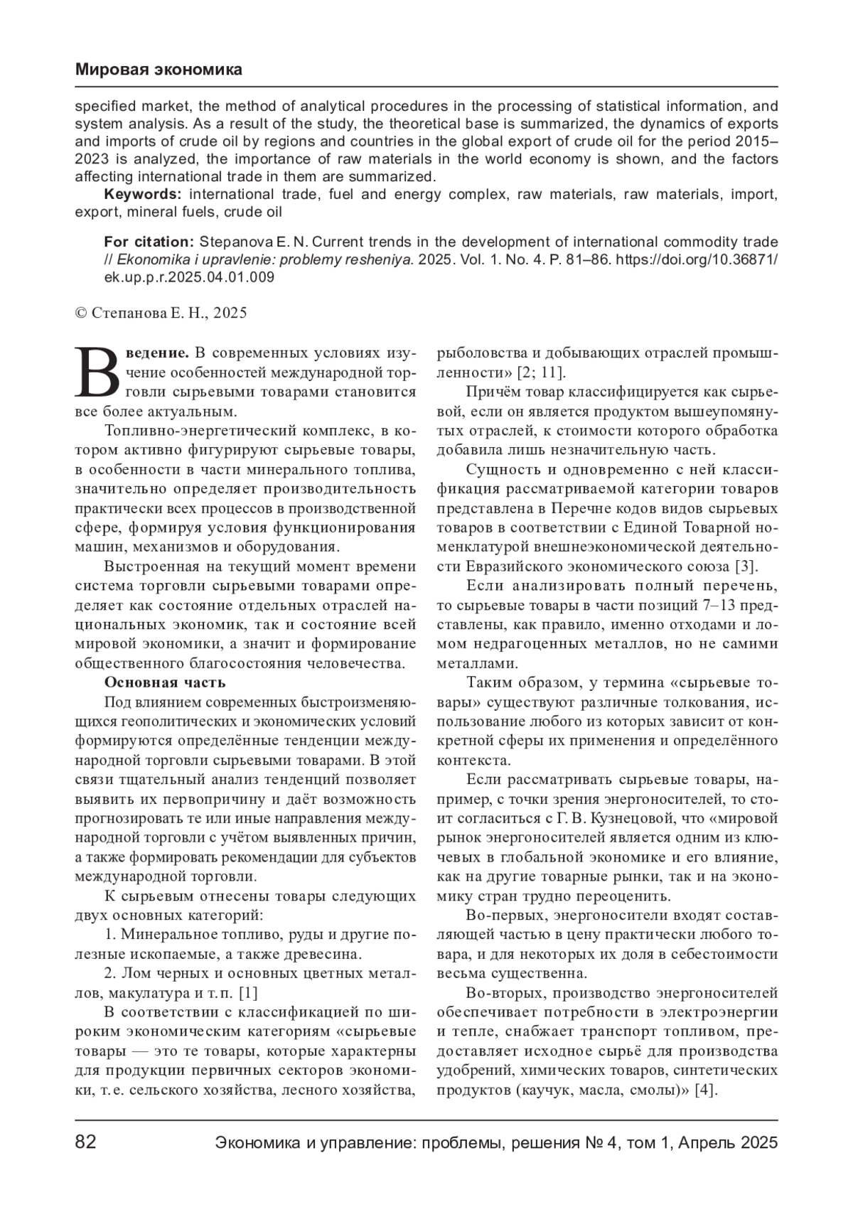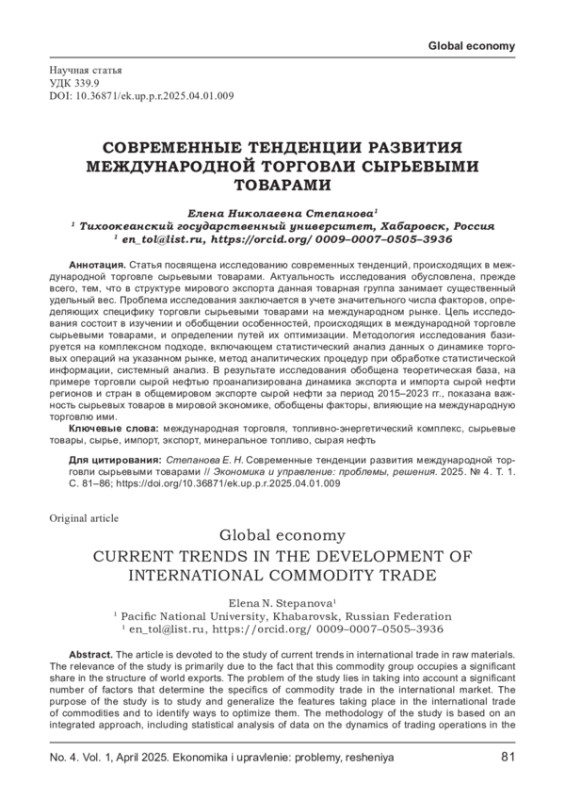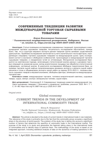 СТЕПАНОВА Е. Н. СОВРЕМЕННЫЕ ТЕНДЕНЦИИ РАЗВИТИЯ МЕЖДУНАРОДНОЙ ТОРГОВЛИ СЫРЬЕВЫМИ ТОВАРАМИ // ЭКОНОМИКА И УПРАВЛЕНИЕ: ПРОБЛЕМЫ, РЕШЕНИЯ. 2025. ТОМ 1 № 4