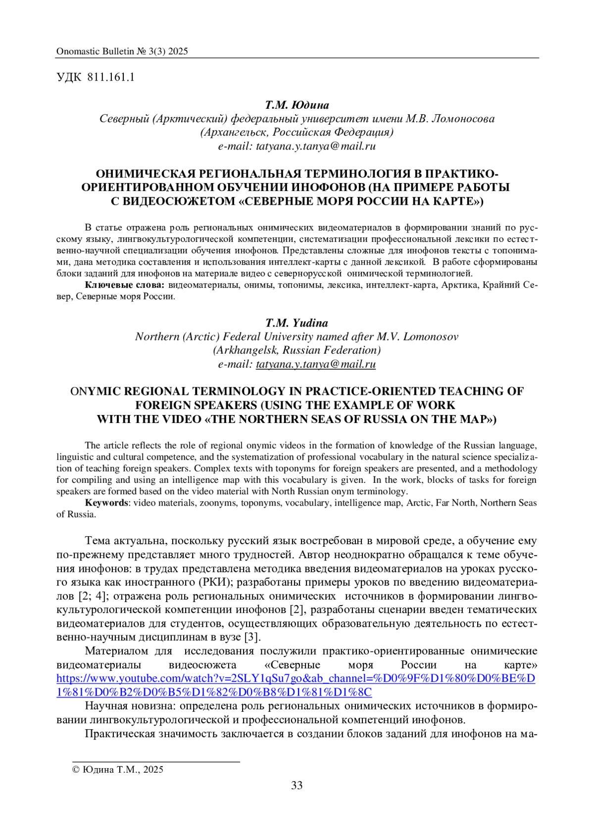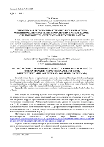 ЮДИНА Т. М. ОНИМИЧЕСКАЯ РЕГИОНАЛЬНАЯ ТЕРМИНОЛОГИЯ В ПРАКТИКО-ОРИЕНТИРОВАННОМ ОБУЧЕНИИ ИНОФОНОВ (НА ПРИМЕРЕ РАБОТЫ С ВИДЕОСЮЖЕТОМ «СЕВЕРНЫЕ МОРЯ РОССИИ НА КАРТЕ») // ОНОМАСТИЧЕСКИЙ ВЕСТНИК. 2025. № 3 (3)