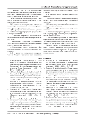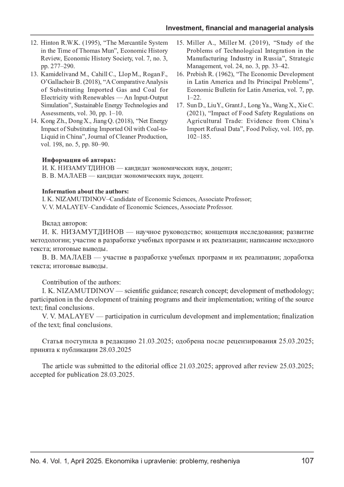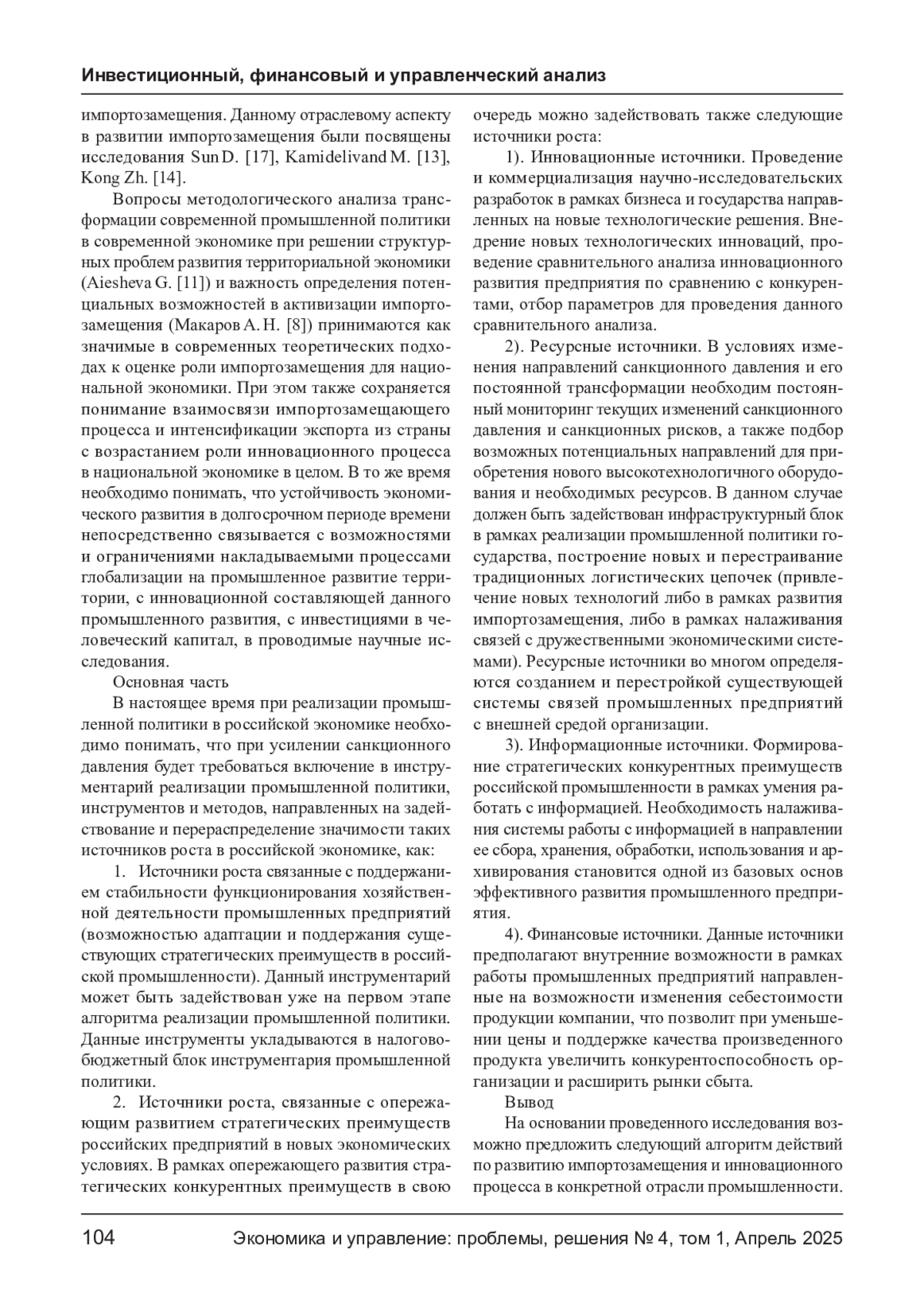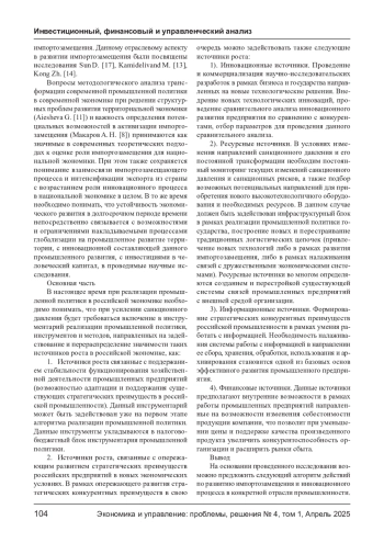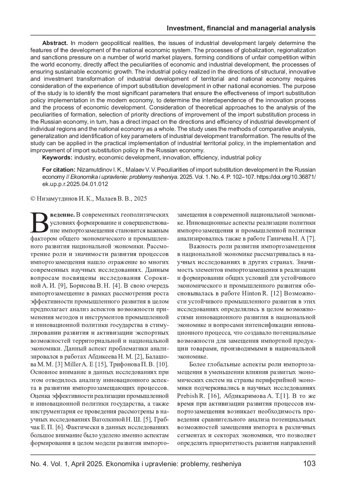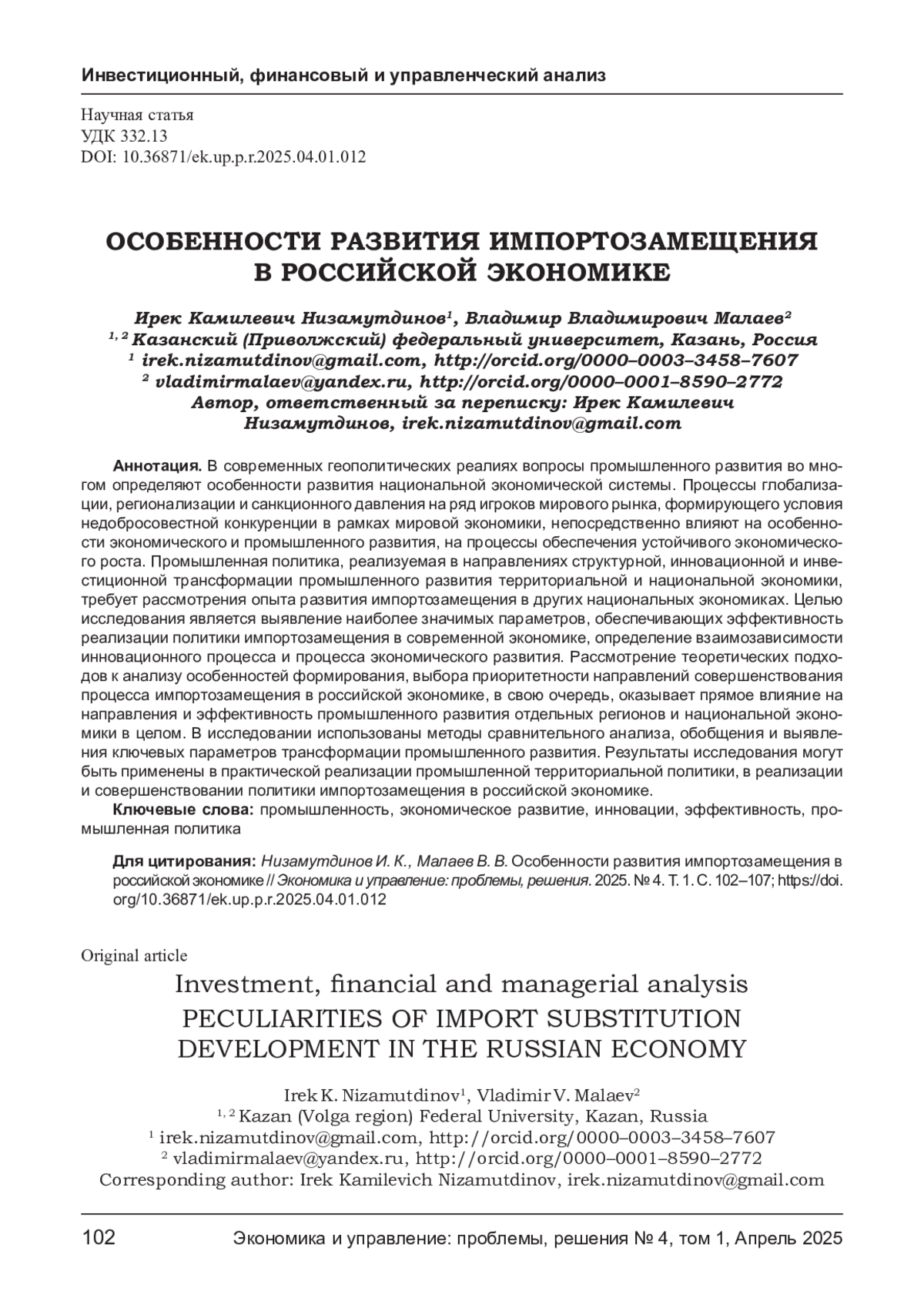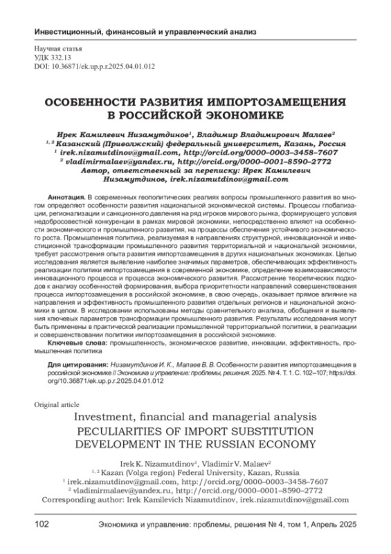 НИЗАМУТДИНОВ И. К., МАЛАЕВ В. В. ОСОБЕННОСТИ РАЗВИТИЯ ИМПОРТОЗАМЕЩЕНИЯ В РОССИЙСКОЙ ЭКОНОМИКЕ // ЭКОНОМИКА И УПРАВЛЕНИЕ: ПРОБЛЕМЫ, РЕШЕНИЯ. 2025. ТОМ 1 № 4