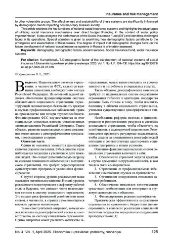 В данной научной статье представлены результаты исследования взаимосвязи демографических факторов и развития национальных систем социального страхования в Российской Федерации. Актуальность темы обусловлена важнейшей ролью, которую играют системы социального страхования в социальной политике государства, обеспечивая защиту и выплаты гражданам, временно утратившим трудоспособность, а также другим уязвимым группам населения. Эффективность и устойчивость этих систем оказываются под влиянием демографических тенденций, оказывающих значительное воздействие на современное российское общество. В рамках работы рассматриваются ключевые функции, выполняемые национальными системами социального страхования. Подчеркиваются преимущества применения механизмов социального страхования по сравнению с прямым бюджетным финансированием в контексте реализации социальной политики государства. Также анализируется эффективность работы Фонда социального страхования (ФСС) и выявляются проблемы, с которыми он сталкивается в своей деятельности. Особое внимание уделяется исследованию влияния демографических факторов на возникновение и усугубление этих проблем. В завершение статьи проводится оценка влияния демографических изменений на перспективы развития национальных систем социального страхования в России.