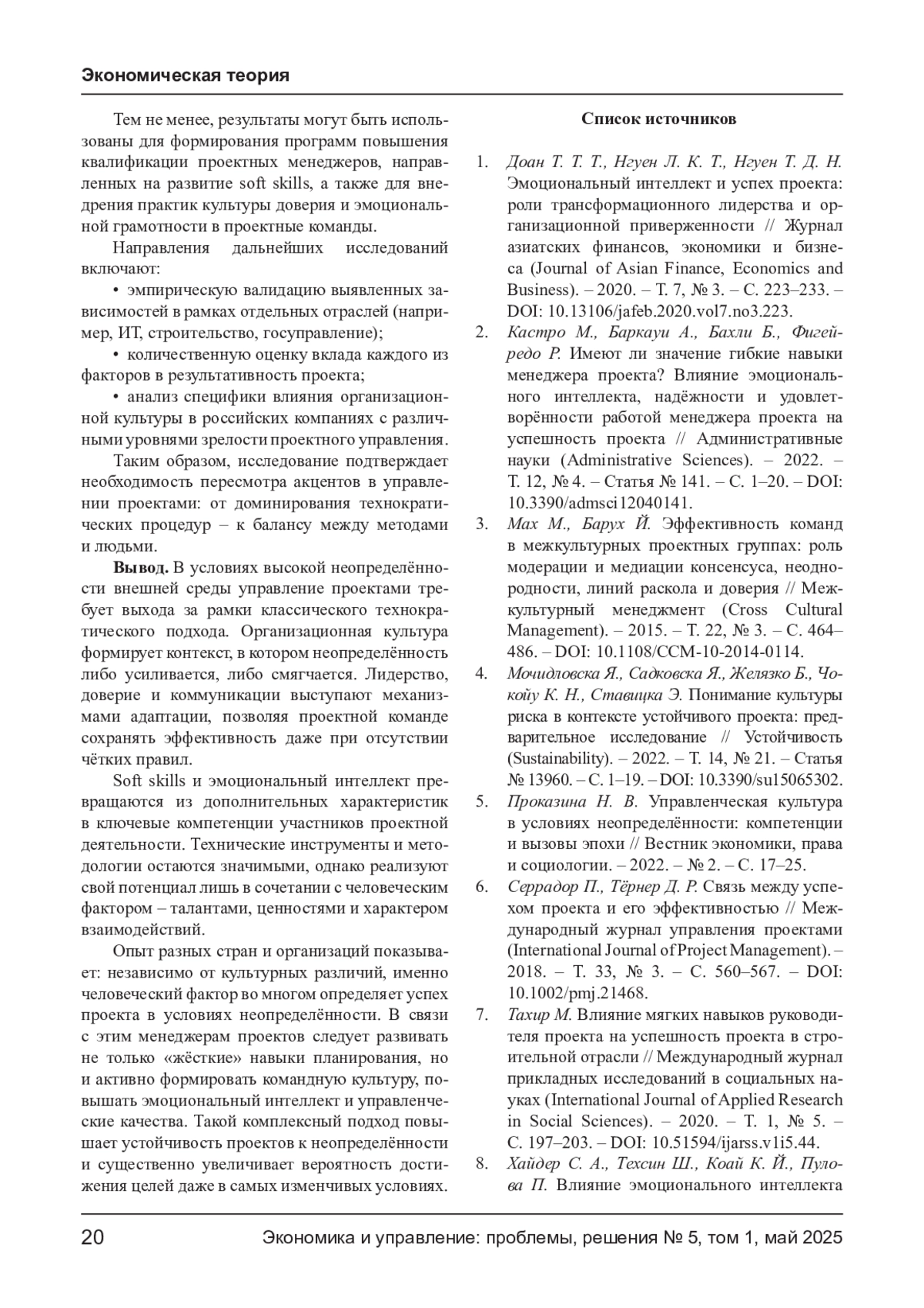 1. Доан Т. Т. Т., Нгуен Л. К. Т., Нгуен Т. Д. Н. Эмоциональный интеллект и успех проекта: роли трансформационного лидерства и организационной приверженности // Журнал азиатских финансов, экономики и бизнеса (Journal of Asian Finance, Economics and Business). - 2020. - Т. 7, № 3. - С. 223-233. -. DOI: 10.13106/jafeb.2020.vol7.no3.223