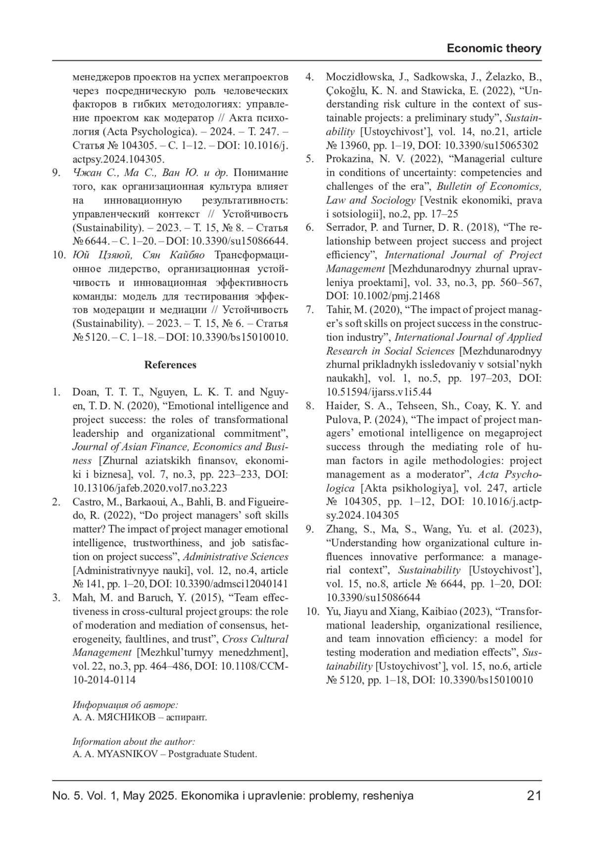 8. Хайдер С. А., Техсин Ш., Коай К. Й., Пулова П. Влияние эмоционального интеллекта менеджеров проектов на успех мегапроектов через посредническую роль человеческих факторов в гибких методологиях: управление проектом как модератор // Актa психология (Acta Psychologica). - 2024. - Т. 247. - Статья № 104305. - С. 1-12. -. DOI: 10.1016/j.actpsy.2024.104305