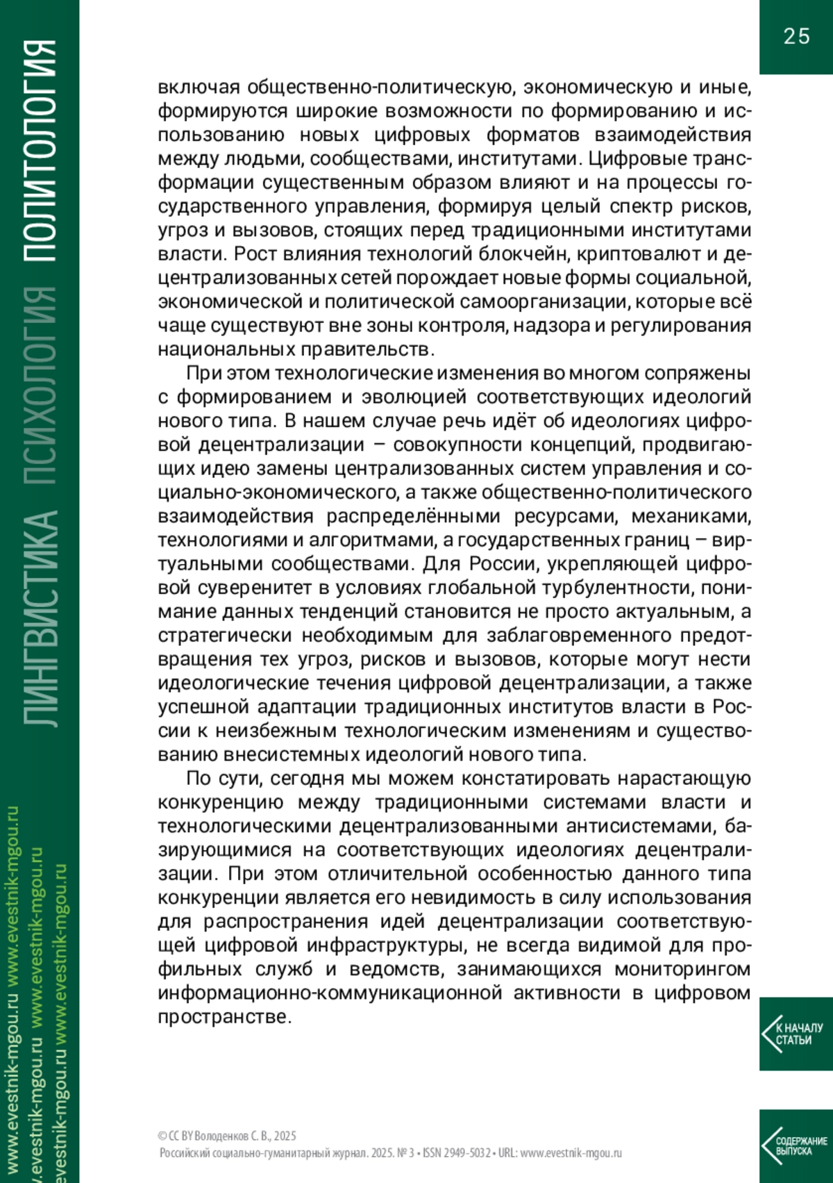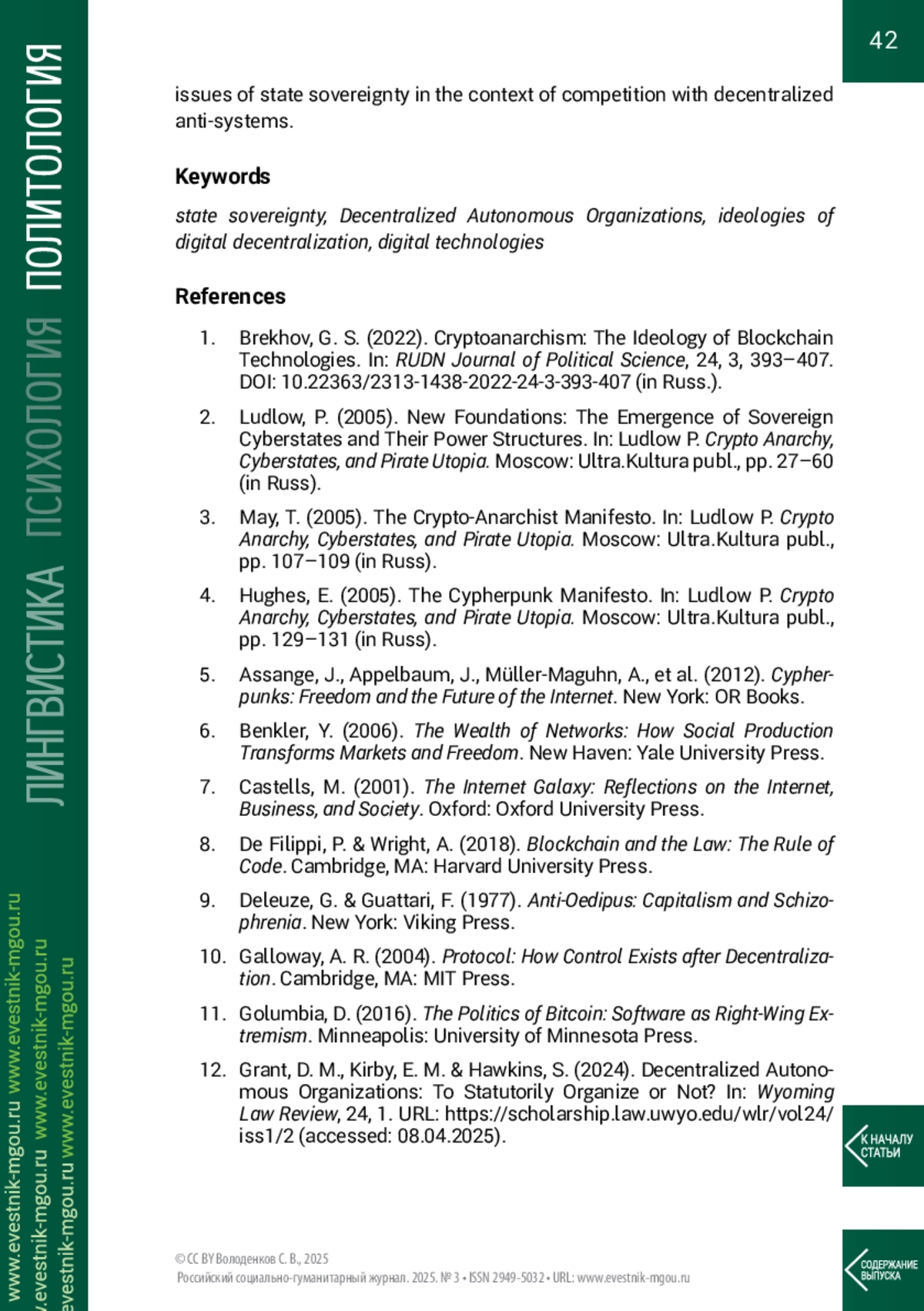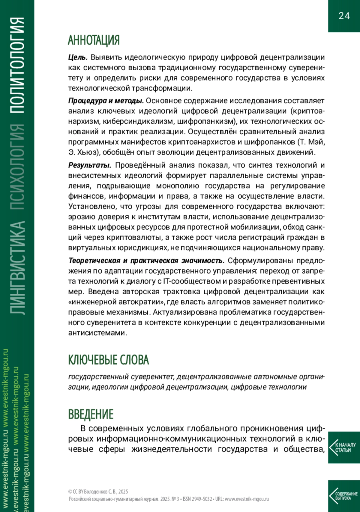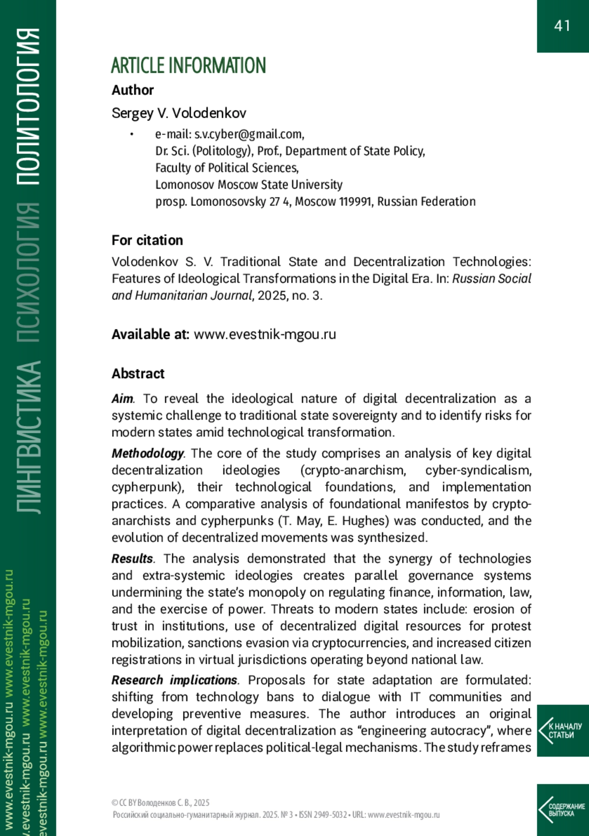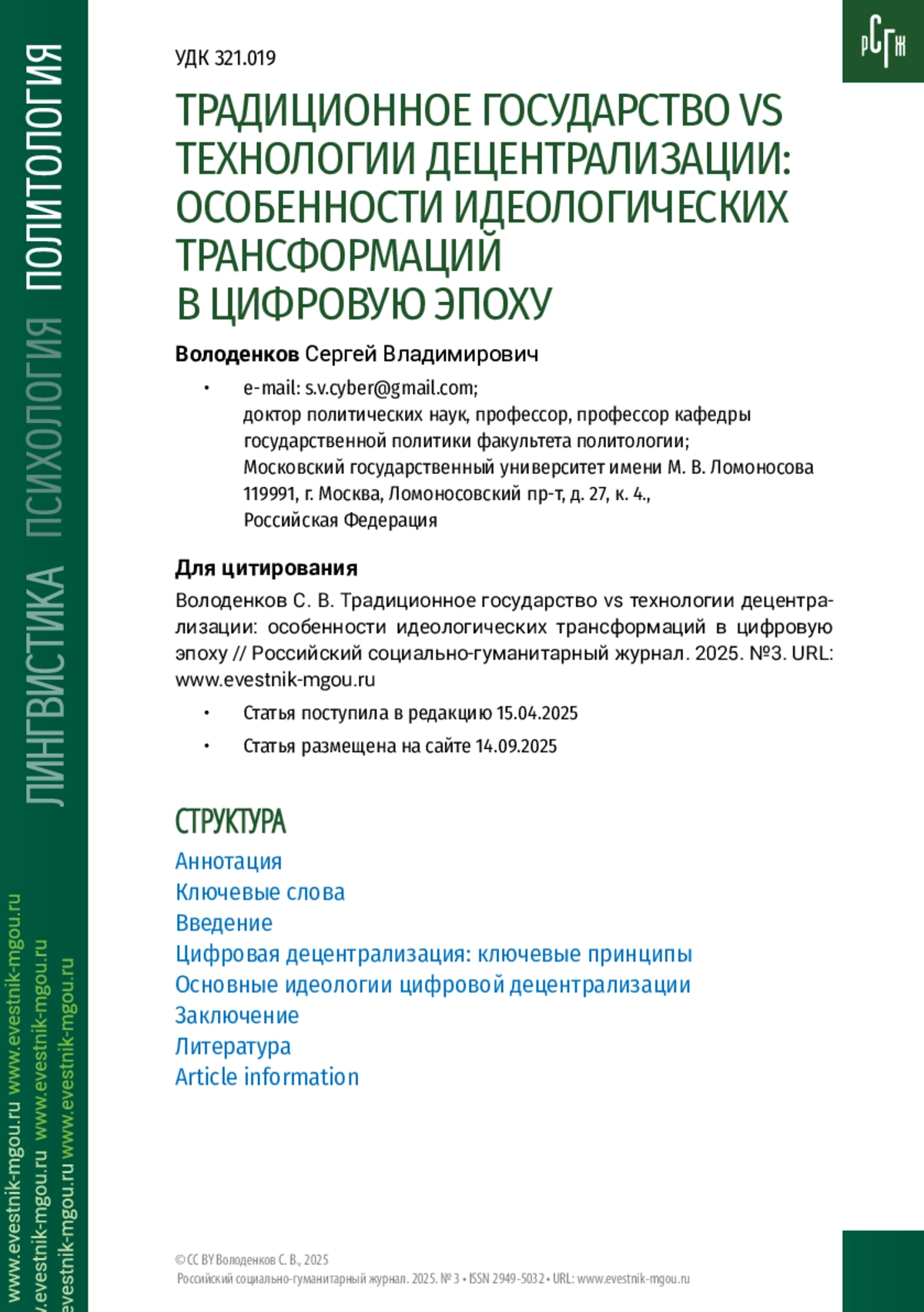 Цель. Выявить идеологическую природу цифровой децентрализации как системного вызова традиционному государственному суверенитету и определить риски для современного государства в условиях технологической трансформации.