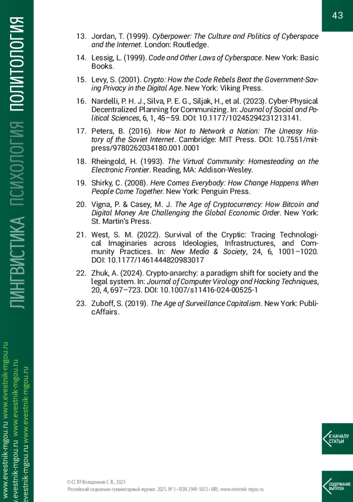 Процедура и методы. Основное содержание исследования составляет анализ ключевых идеологий цифровой децентрализации (криптоанархизм, киберсиндикализм, шифропанкизм), их технологических оснований и практик реализации. Осуществлён сравнительный анализ программных манифестов криптоанархистов и шифропанков (Т. Мэй, Э. Хьюз), обобщён опыт эволюции децентрализованных движений.