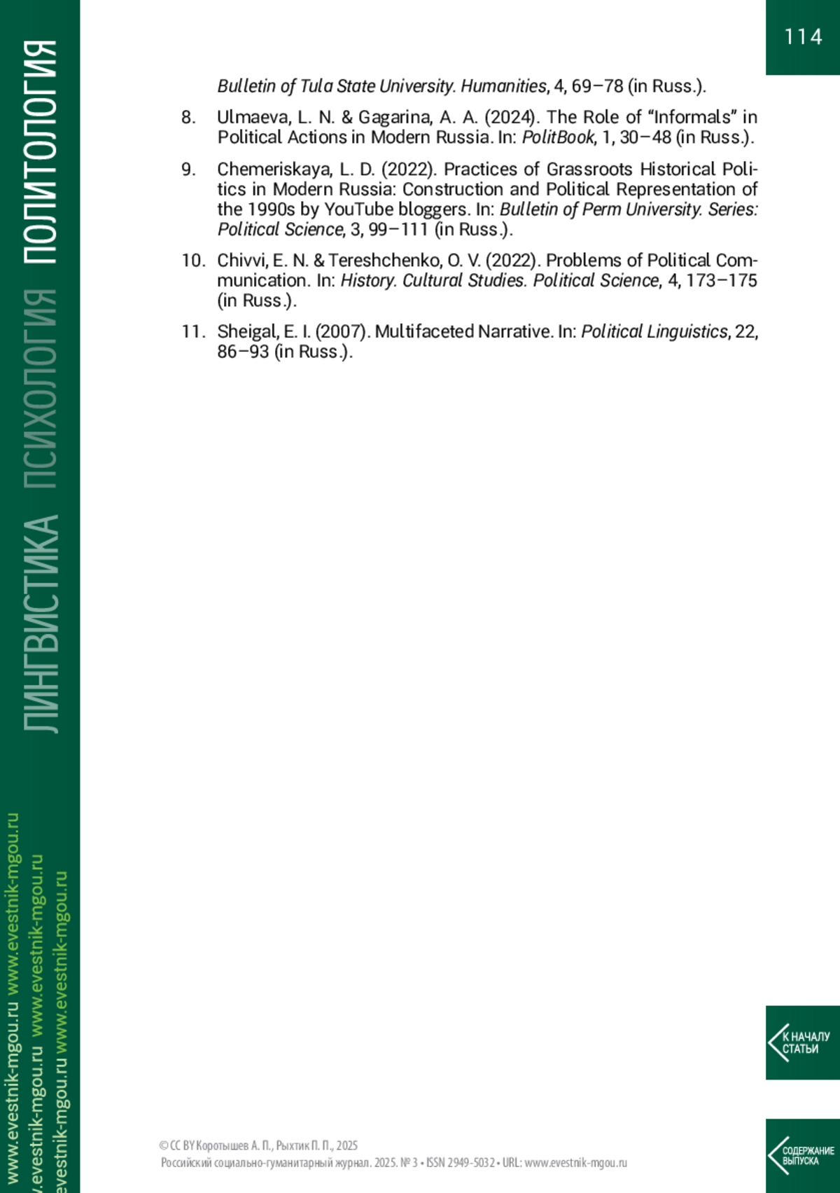 9. Чемериская Л. Д. Практики низовой исторической политики в современной России: конструирование и политическая репрезентация 1990-х гг. Youtube-блогерами // Вестник Пермского университета. Серия: Политология. 2022. №3. С. 99-111.