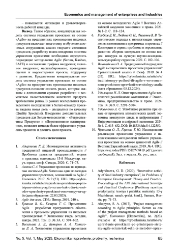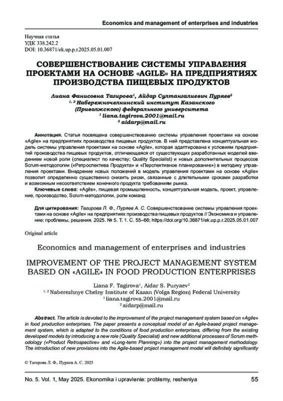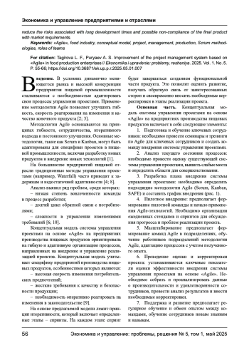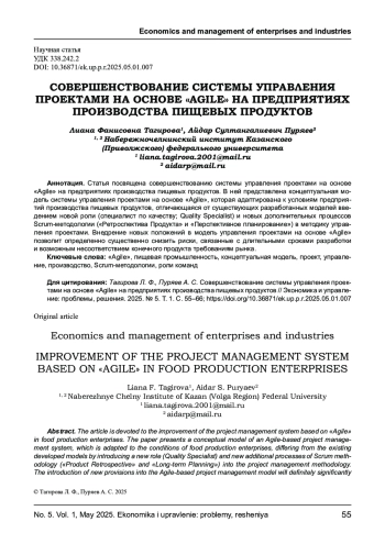 Статья: СОВЕРШЕНСТВОВАНИЕ СИСТЕМЫ УПРАВЛЕНИЯ ПРОЕКТАМИ НА ОСНОВЕ «AGILE» НА ПРЕДПРИЯТИЯХ ПРОИЗВОДСТВА ПИЩЕВЫХ ПРОДУКТОВ (2025)