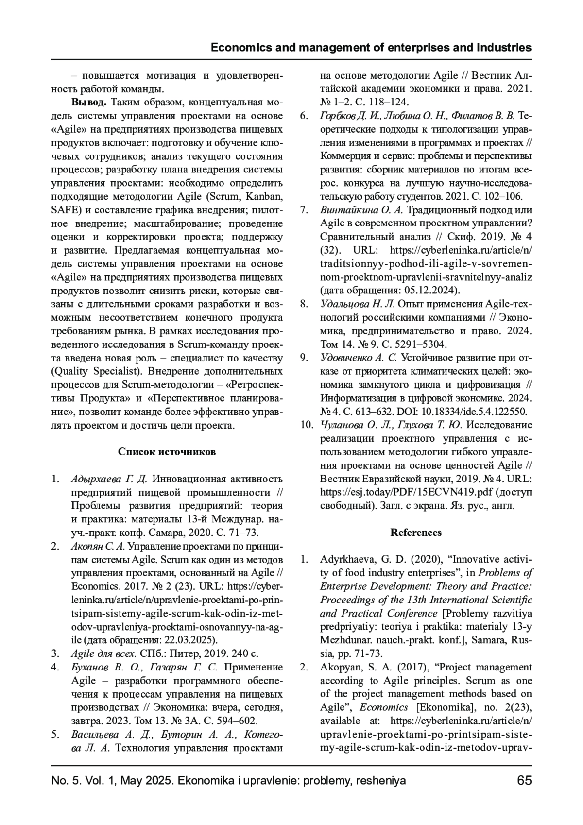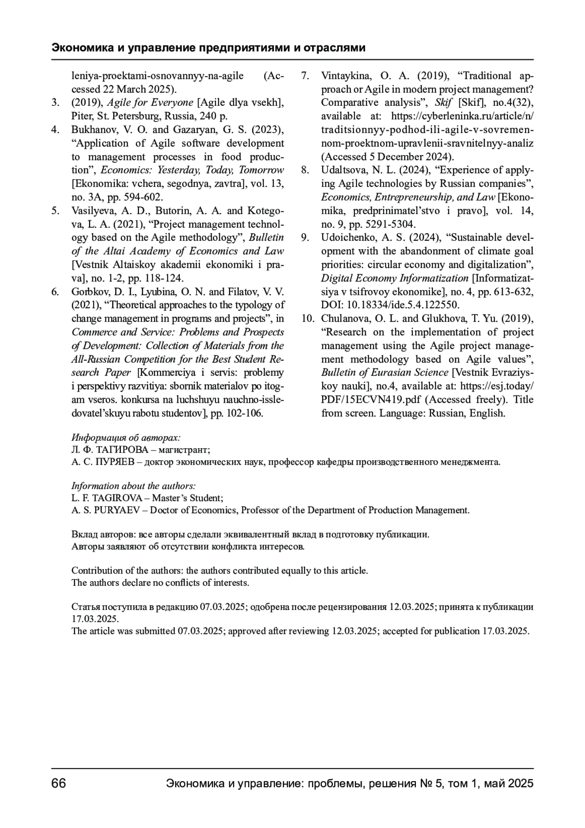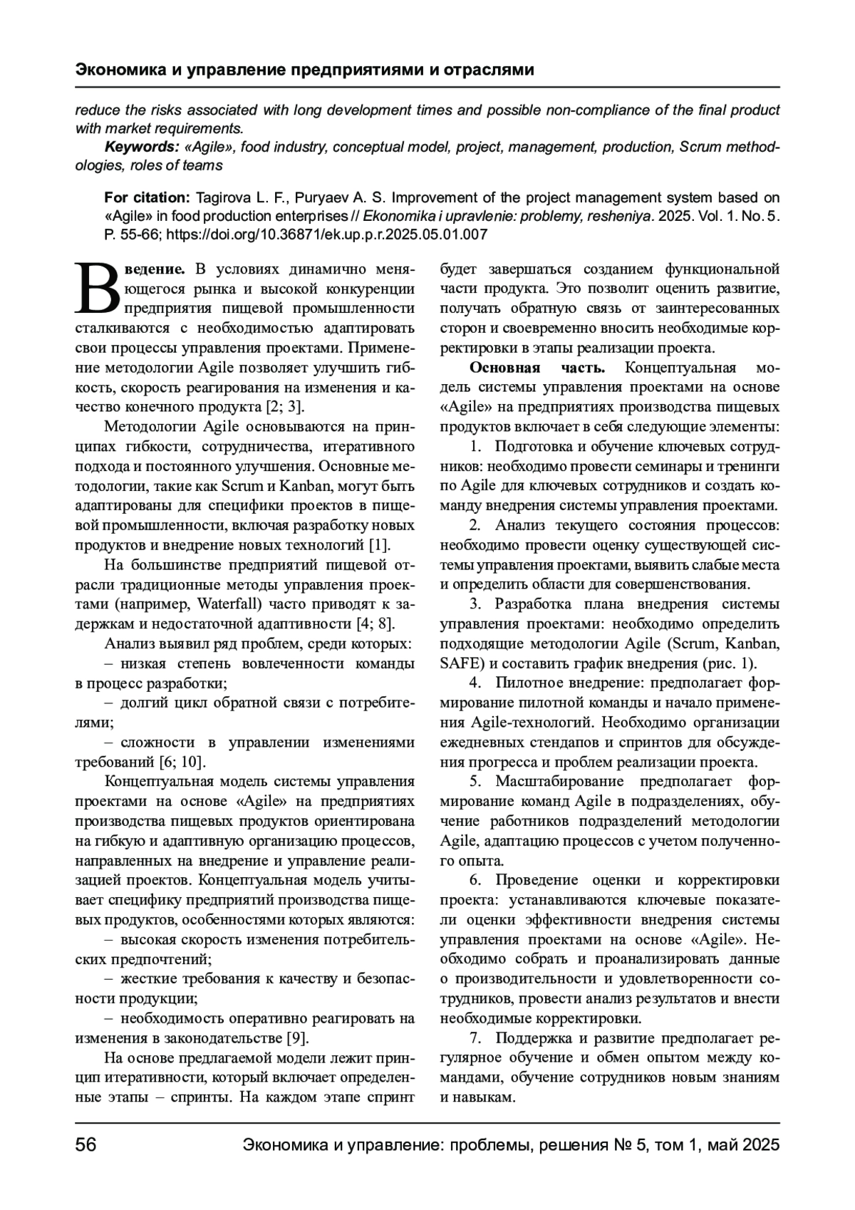 ТАГИРОВА Л. Ф., ПУРЯЕВ А. С. СОВЕРШЕНСТВОВАНИЕ СИСТЕМЫ УПРАВЛЕНИЯ ПРОЕКТАМИ НА ОСНОВЕ «AGILE» НА ПРЕДПРИЯТИЯХ ПРОИЗВОДСТВА ПИЩЕВЫХ ПРОДУКТОВ // ЭКОНОМИКА И УПРАВЛЕНИЕ: ПРОБЛЕМЫ, РЕШЕНИЯ. 2025. ТОМ 1 № 5