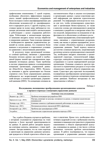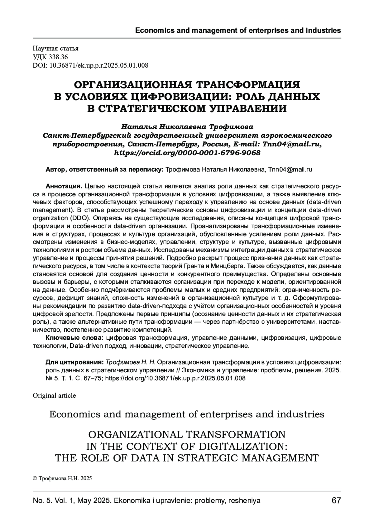 ТРОФИМОВА Н. Н. ОРГАНИЗАЦИОННАЯ ТРАНСФОРМАЦИЯ В УСЛОВИЯХ ЦИФРОВИЗАЦИИ: РОЛЬ ДАННЫХ В СТРАТЕГИЧЕСКОМ УПРАВЛЕНИИ // ЭКОНОМИКА И УПРАВЛЕНИЕ: ПРОБЛЕМЫ, РЕШЕНИЯ. 2025. ТОМ 1 № 5