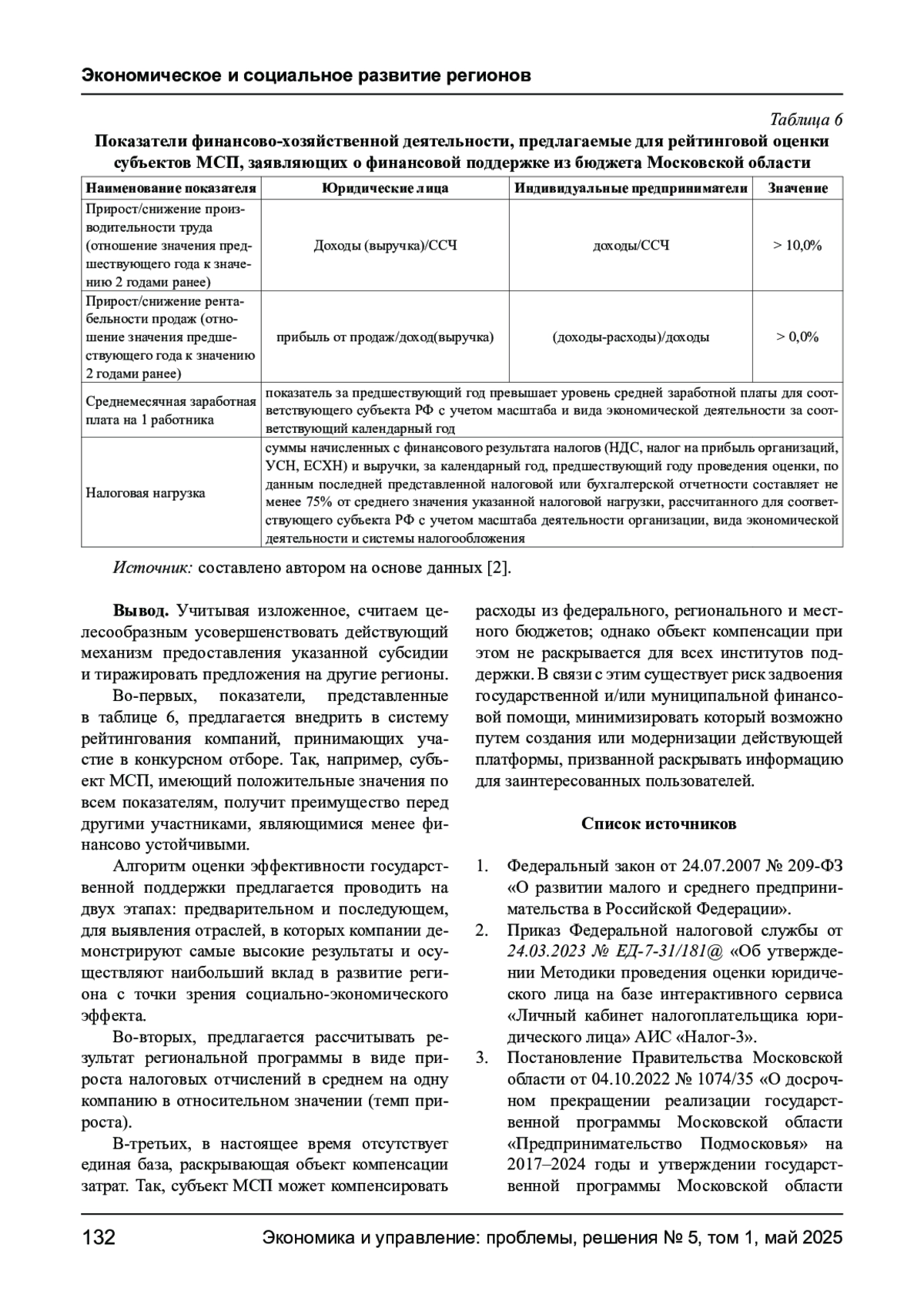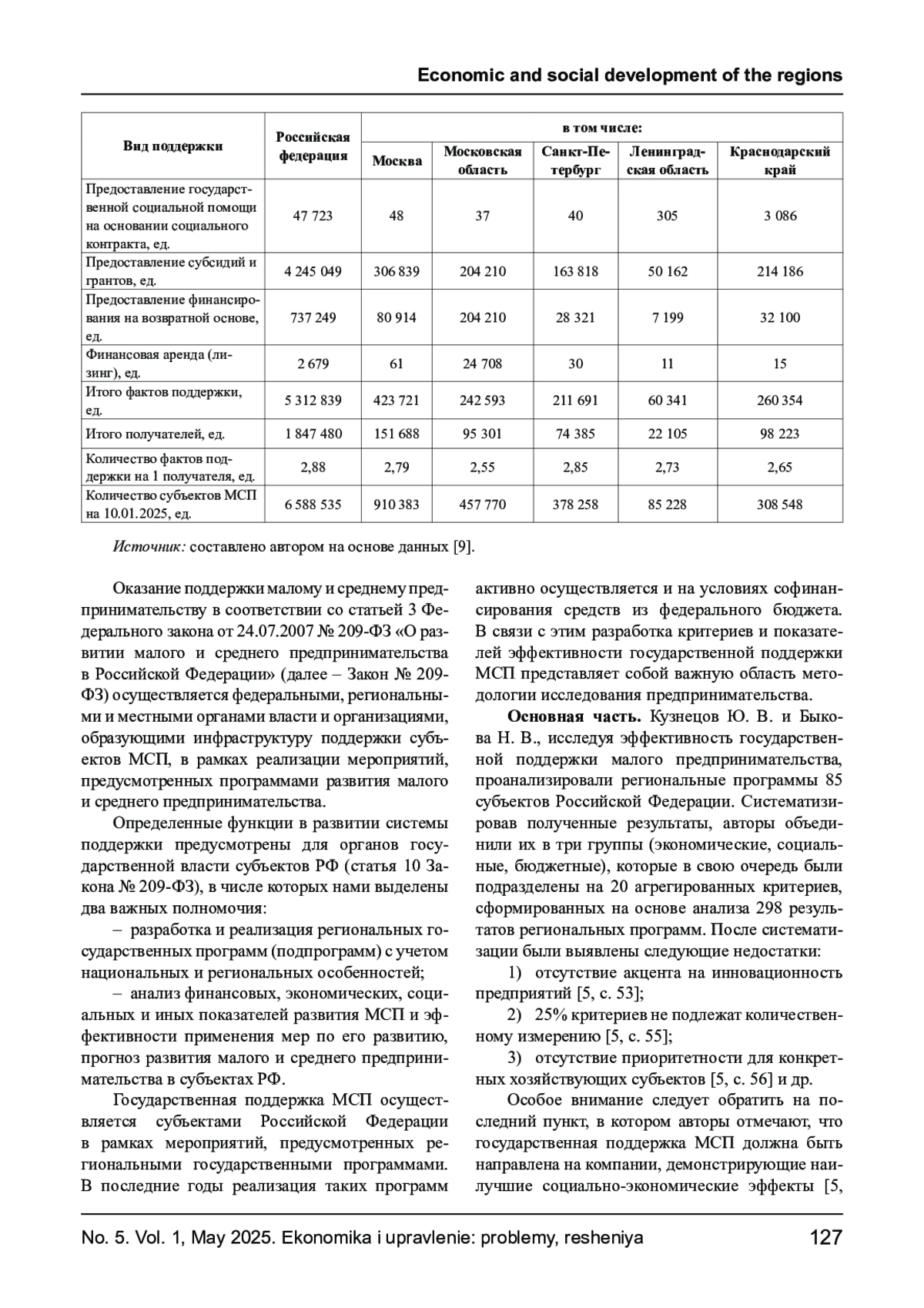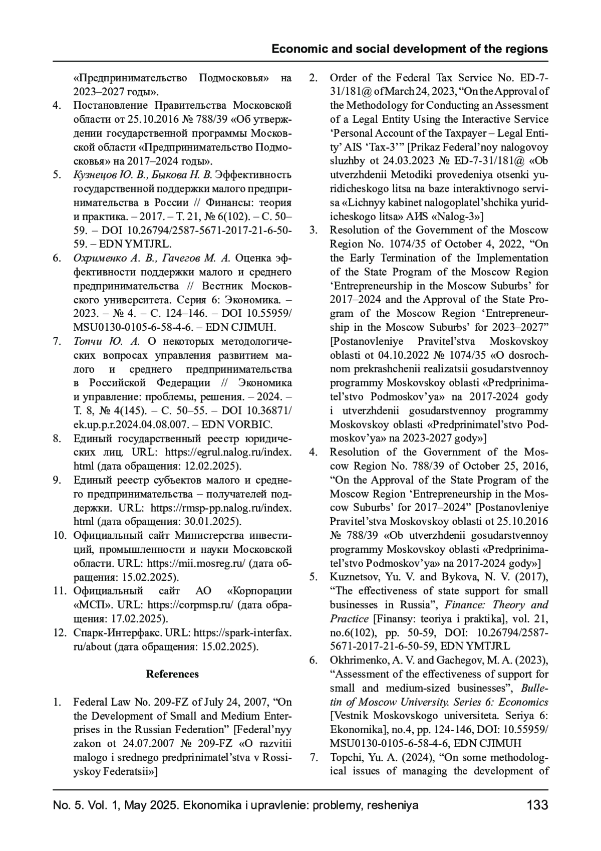 5. Кузнецов Ю. В., Быкова Н. В. Эффективность государственной поддержки малого предпринимательства в России // Финансы: теория и практика. - 2017. - Т. 21, № 6(102). - С. 50- 59. DOI: 10.26794/2587-5671-2017-21-6-50-59 EDN: YMTJRL