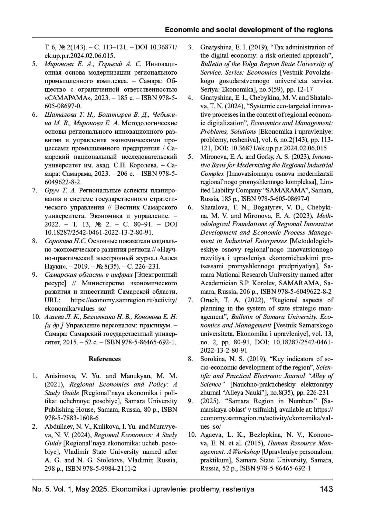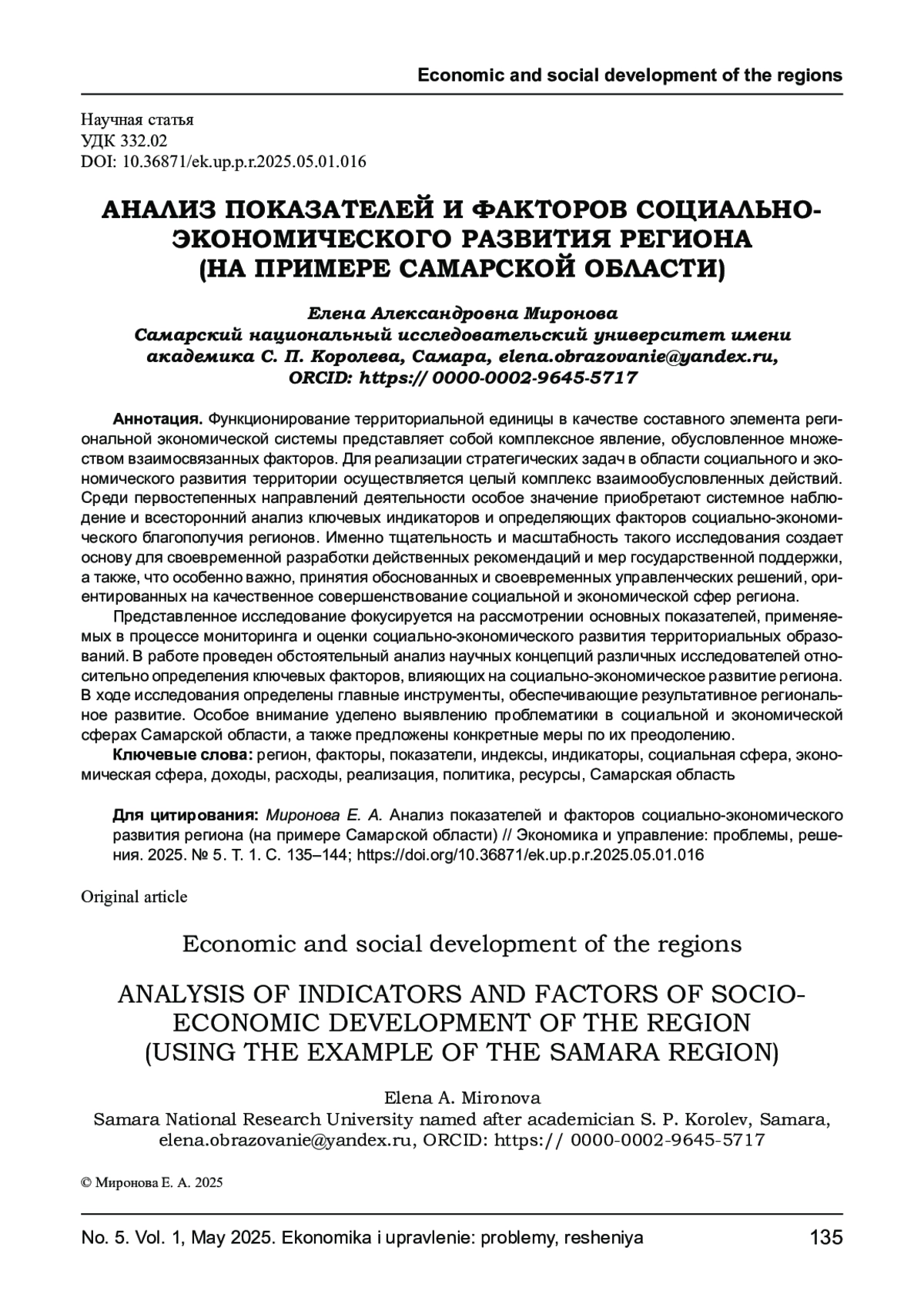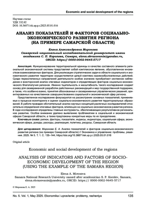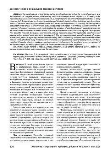 МИРОНОВА Е. А. АНАЛИЗ ПОКАЗАТЕЛЕЙ И ФАКТОРОВ СОЦИАЛЬНО-ЭКОНОМИЧЕСКОГО РАЗВИТИЯ РЕГИОНА (НА ПРИМЕРЕ САМАРСКОЙ ОБЛАСТИ) // ЭКОНОМИКА И УПРАВЛЕНИЕ: ПРОБЛЕМЫ, РЕШЕНИЯ. 2025. ТОМ 1 № 5