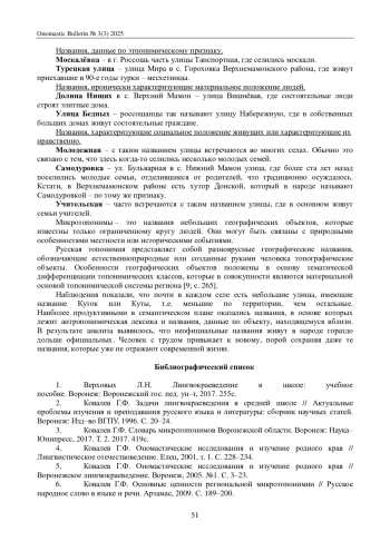 Цель настоящей статьи – изучение официальных и неофициальных микротопонимов, составляющих специфическую часть лексики Воронежской области. Топонимы – это особые лингвистические единицы, и поэтому, безусловно, их должна изучать лингвистика. Микротопонимы – один из видов топонимов, название небольшого местного объекта. В ходе исследования была выявлена специфика использования микротопонимов в Верхнемамонском и Россошанском районах. В ходе сопоставительного анализа на качественном уровне проведена корреляция между уровнями топонимизации и классификацией геоморфологических объектов, определены критерии микротопонимов. В настоящее время значительное внимание уделяется изучению локальных особенностей языка, которые отражают уникальные культурные и исторические аспекты определенных регионов. Особую ценность в этом контексте представляют микротопонимы, которые являются важным элементом лингвистического ландшафта и культурного наследия региона. Воронежская область, богатая своими историческими и культурными традициями, обладает уникальным микротопонимическим материалом, изучение которого может дать новые знания не только в области лингвистики, но и в методике преподавания русского языка.