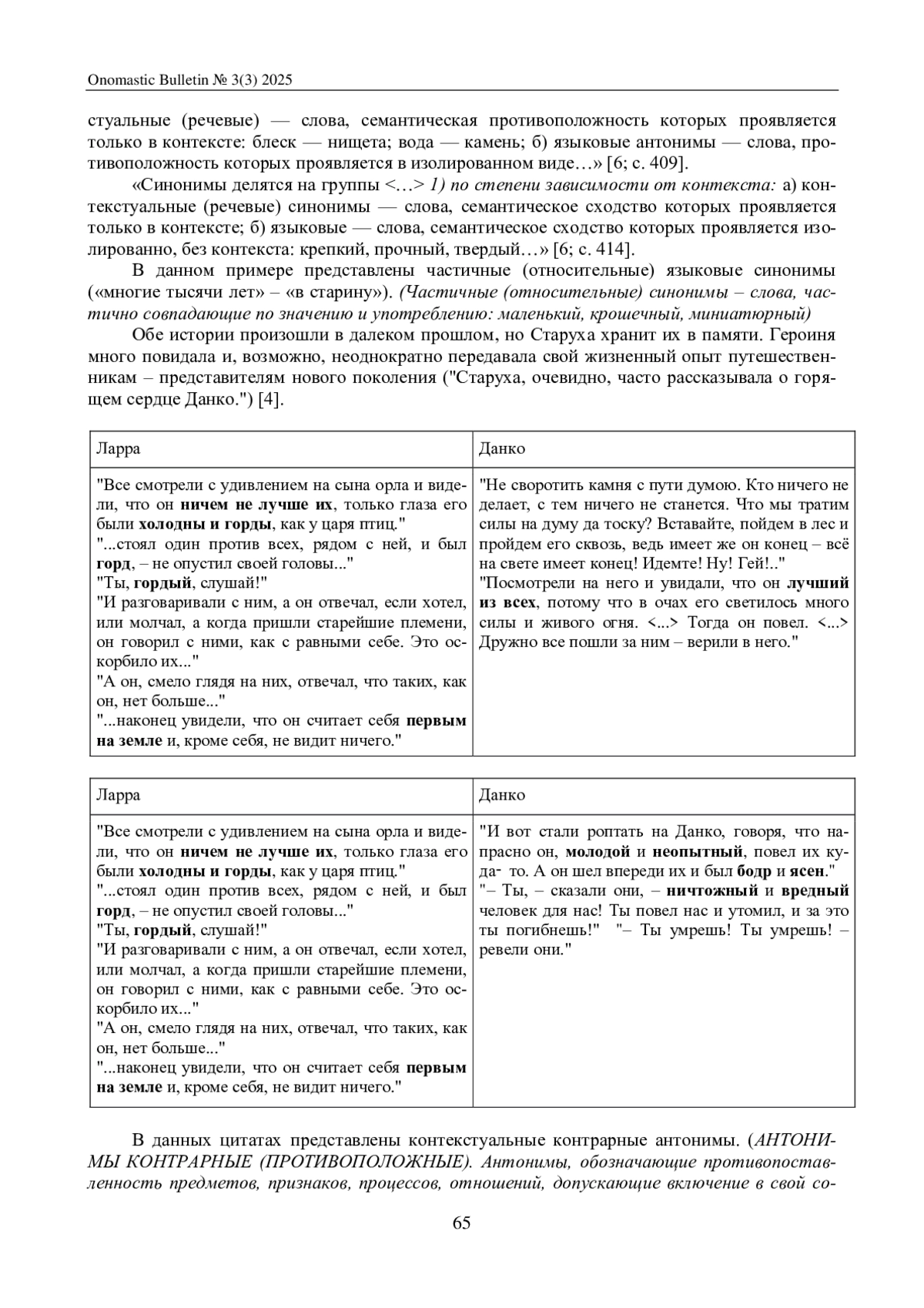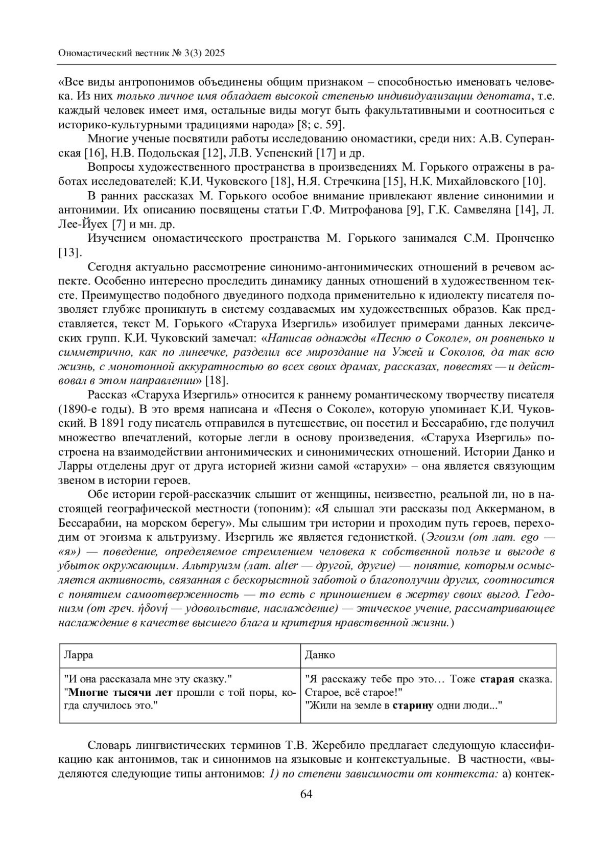 В статье рассматривается ономастическое пространство рассказа М. Горького «Старуха Изергиль». Значение имён персонажей помогает автору в раскрытии замысла произведения. Представлены образы Данко и Ларры с точки зрения синонимо-антонимичной парадигмы.