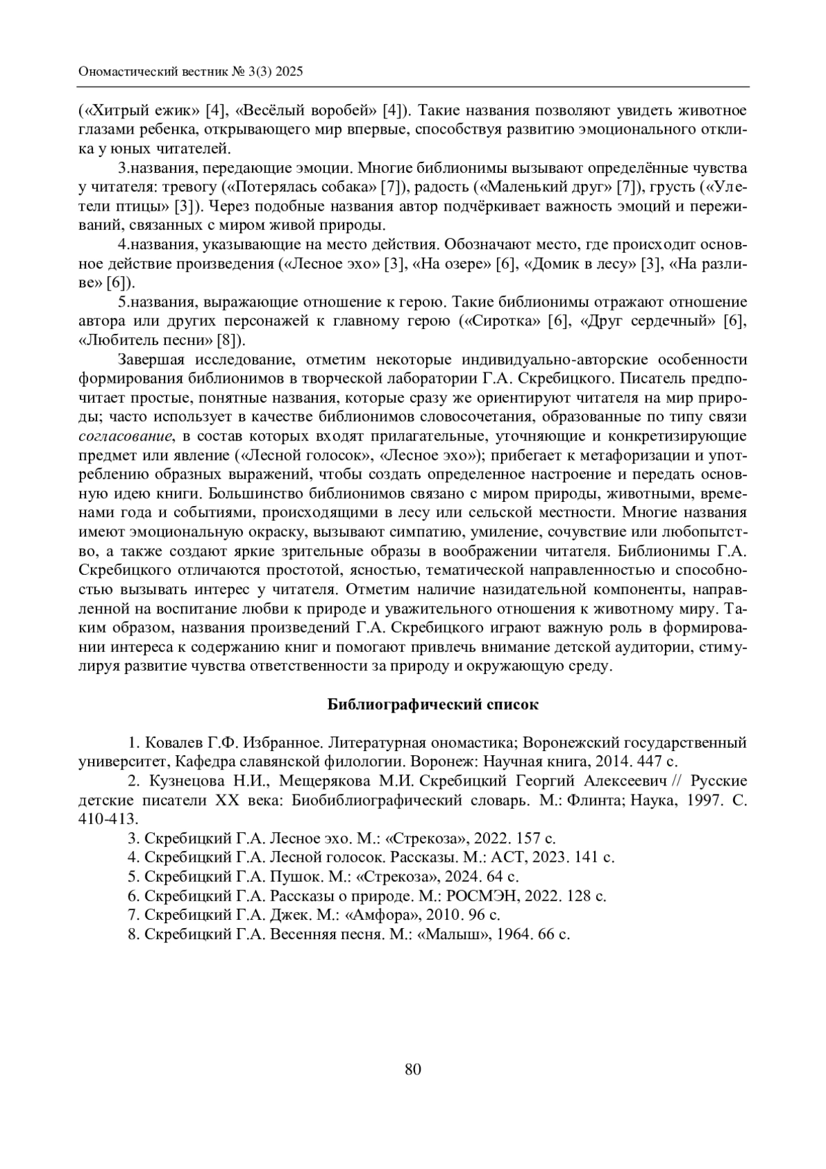 Аннотируемая статья посвящена исследованию структурно-семантических особенностей библионимов писателя-натуралиста Г. А. Скребицкого. Рассматривается специфика названия книг и рассказов Г. А. Скребицкого, определяющая ключевое направление развития его творческой деятельности. Анализируются композиционные приемы и выразительные средства, используемые писателем для обозначения собственных произведений, акцентируя внимание на природных объектах и животных, занимающих важное место в сюжетах его лите-ратуры. Исследование основывается на междисциплинарном подходе, сочетающем методы лингвистического анализа и теории номинации. Подчеркивается роль структуры и значения библионимов как важнейшего компонента в понимании общей концепции природоведческой прозы Г. А. Скребицкого. Описываются пути выражения автором своего отношения к природе посредством особых способов называния своих произведений. Кроме того, рассматривается взаимодействие формы и содержания библионимов, демонстрируя связь между названием и идейно-тематическим содержанием произведений писателя. Исследуется вклад структурно-семантических характеристик библионимов в формирование читательского восприятия и интерпретации художественных образов природы в литературе натуралистического направления. Они заключаются в их простоте, ясности, тематической направленности и способности вызывать интерес у читателя. Отмечается, что писатель использует разнообразные типы названий, чтобы отразить суть произведения, создать яркий образ и привлечь внимание к миру природы и животных. Это легко объяснить, зная цель автора: простота и доступность названий делают его произведения привлекательными для детской аудитории, помогая им познавать окружающий мир.