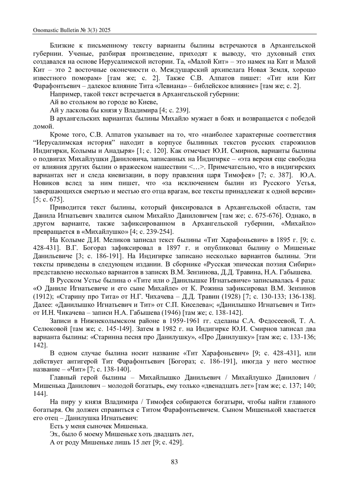 В статье рассматриваются особенности именования былинного образа в двух селах на реках Колыма и Индигирка. Имеются записи вариантов былины с конца XIX в. по 80-е гг. ХХ в. На примере образа богатыря Михайлы Даниловича прослеживается местная специфика, связанная с личным отношением исполнителя к своему герою.