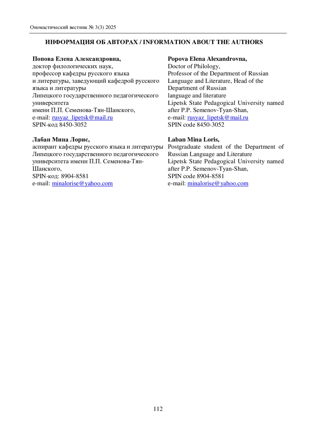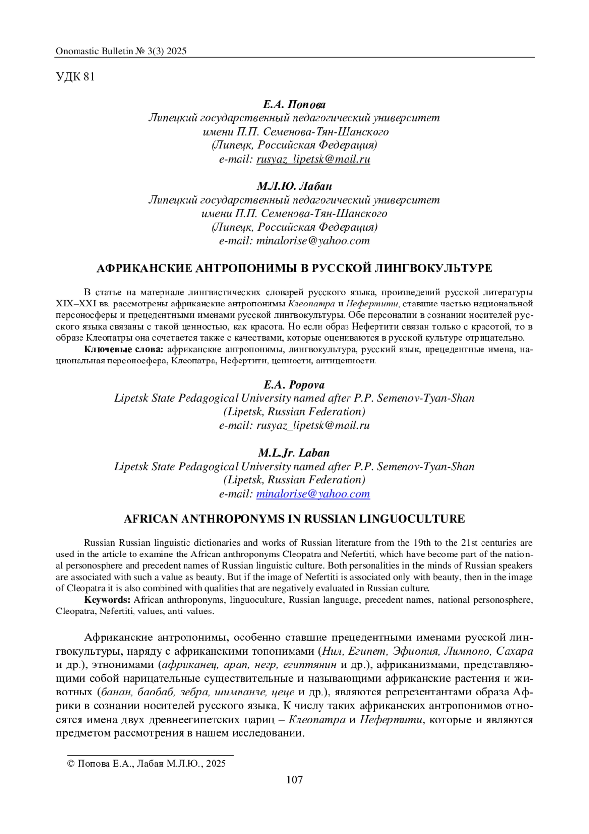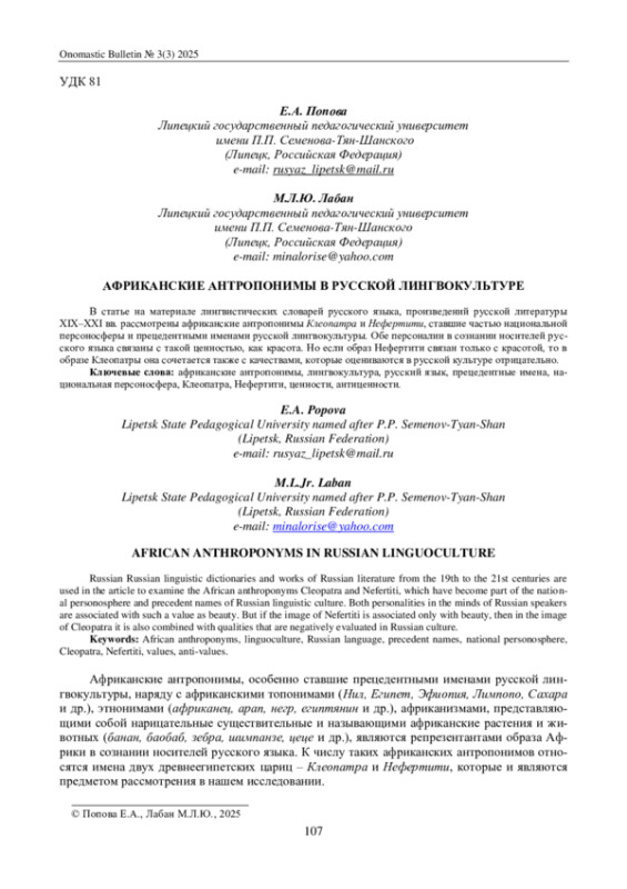 ПОПОВА Е. А., ЛАБАН М. Л. АФРИКАНСКИЕ АНТРОПОНИМЫ В РУССКОЙ ЛИНГВОКУЛЬТУРЕ // ОНОМАСТИЧЕСКИЙ ВЕСТНИК. 2025. № 3 (3)
