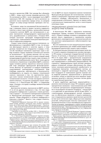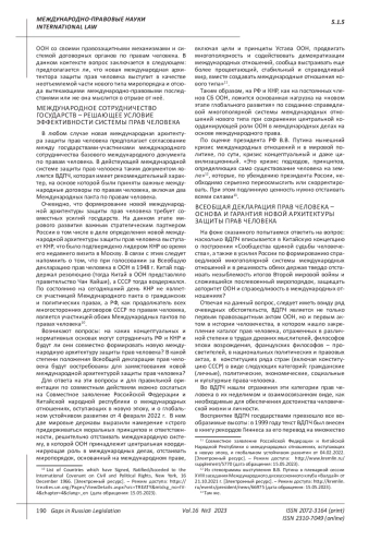 В условиях глубокого кризиса межгосударственных отношений, негативно влияющих на ключевые составляющие системы коллективной безопасности на основе Устава ООН, включая универсальные правозащитные механизмы, все более актуальным и востребованным становится обоснованная дискуссия о новой международной архитектуре защиты прав человека, как важная сфера международного и национального правопорядка. Целью предлагаемой работы является спрогнозировать в какой степени для новой международной архитектуры защиты прав человека будут востребованы концептуальные, нормативные и институциональные основы ныне функционирующей межгосударственной системы защиты прав человека с её сильными и слабыми сторонами какие факторы и обстоятельства могут сыграть в этом деле решающую роль. В результате анализа и учета ключевых моментов и закономерностей, присущих международной политической системе, где главенствующую роль продолжают играть суверенные государства, сформулированы выводы, имеющие концептуальное и прикладное значение, которое могут и должны быть учтены при формировании новой архитектуры защиты пра человека, претендующей адекватно заменить действующую систему защиты прав человека. Эти выводы и вытекающие из них рекомендации основываются на положениях Устава ООН и Всеобщей декларации прав человека, утверждающих необходимость совместного действия государств и институтов глобального управления на основе международного сотрудничества, а также общего понимания характера прав и свобод человека. Только при наличии таких условий возможно конструктивное сотрудничество суверенных государств в сфере прав человека, что в свою очередь будет служить условием всеобщего благосостояния. При отсутствии этих же условий, права человека, наоборот, становятся орудием борьбы, объектом двойных стандартов в международных отношениях и в деятельности международных правозащитных органов.